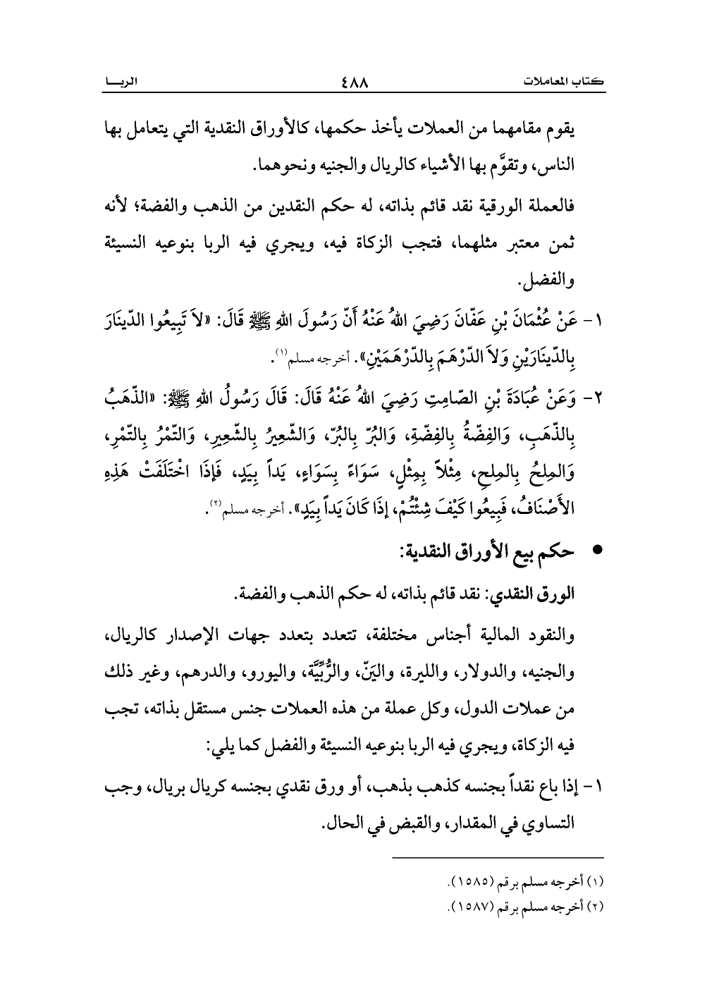 2 - وَعَنْ عُبَادَةَ بْنِ الصّامِتِ رَضِيَ اللهُ عَنْهُ قَالَ: قَالَ رَسُولُ اللهِ - صلى الله عليه وسلم -: «الذّهَبُ بِالذّهَبِ، وَالفِضّةُ بِالفِضّةِ، وَالبُرّ بِالبُرّ، وَالشّعِيرُ بِالشّعِيرِ، وَالتّمْرُ بِالتّمْرِ، وَالمِلحُ بِالمِلحِ، مِثْلاً بِمِثْلٍ، سَوَاءً بِسَوَاءٍ، يَداً بِيَدٍ، فَإذَا اخْتَلَفَتْ هَذِهِ الأَصْنَافُ، فَبِيعُوا كَيْفَ شِئْتُمْ، إذَا كَانَ يَداً بِيَدٍ». أخرجه مسلم (¬2).