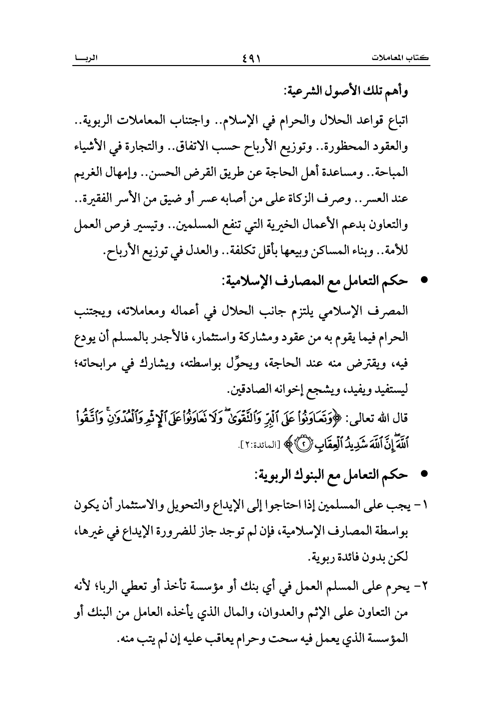 المصرف الإسلامي يلتزم جانب الحلال في أعماله ومعاملاته، ويجتنب الحرام فيما يقوم به من عقود ومشاركة واستثمار، فالأجدر بالمسلم أن يودع فيه، ويقترض منه عند الحاجة، ويحوِّل بواسطته، ويشارك في مرابحاته؛ ليستفيد ويفيد، ويشجع إخوانه الصادقين.