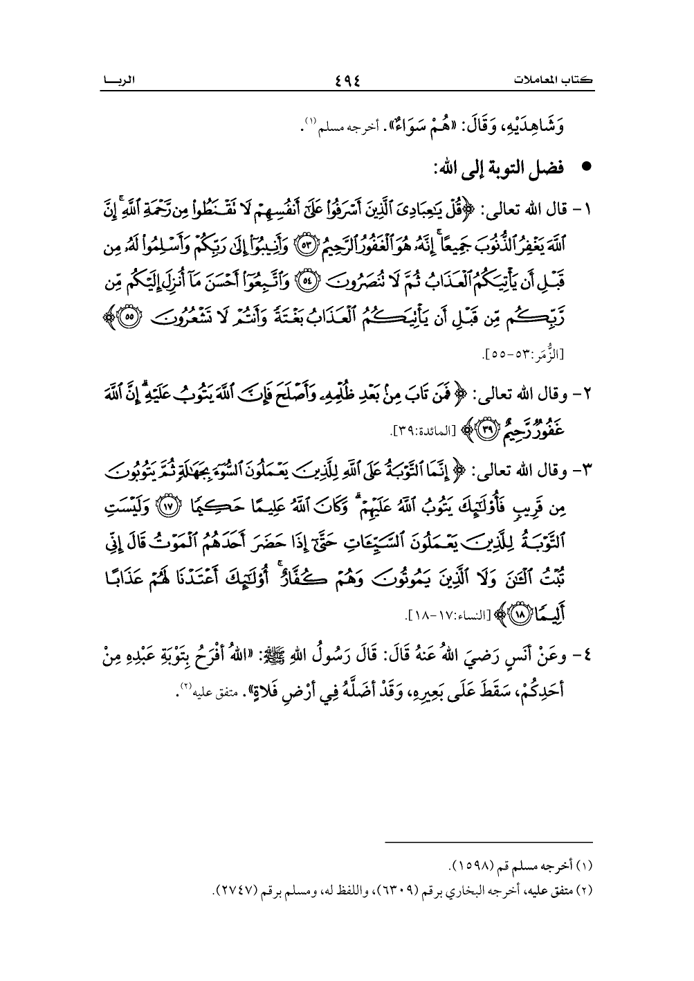 1 - قال الله تعالى: {قُلْ يَاعِبَادِيَ الَّذِينَ أَسْرَفُوا عَلَى أَنْفُسِهِمْ لَا تَقْنَطُوا مِنْ رَحْمَةِ اللَّهِ إِنَّ اللَّهَ يَغْفِرُ الذُّنُوبَ جَمِيعًا إِنَّهُ هُوَ الْغَفُورُ الرَّحِيمُ (53) وَأَنِيبُوا إِلَى رَبِّكُمْ وَأَسْلِمُوا لَهُ مِنْ قَبْلِ أَنْ يَأْتِيَكُمُ الْعَذَابُ ثُمَّ لَا تُنْصَرُونَ (54) وَاتَّبِعُوا أَحْسَنَ مَا أُنْزِلَ إِلَيْكُمْ مِنْ رَبِّكُمْ مِنْ قَبْلِ أَنْ يَأْتِيَكُمُ الْعَذَابُ بَغْتَةً وَأَنْتُمْ لَا تَشْعُرُونَ (55)} [الزُّمَر:53 - 55].