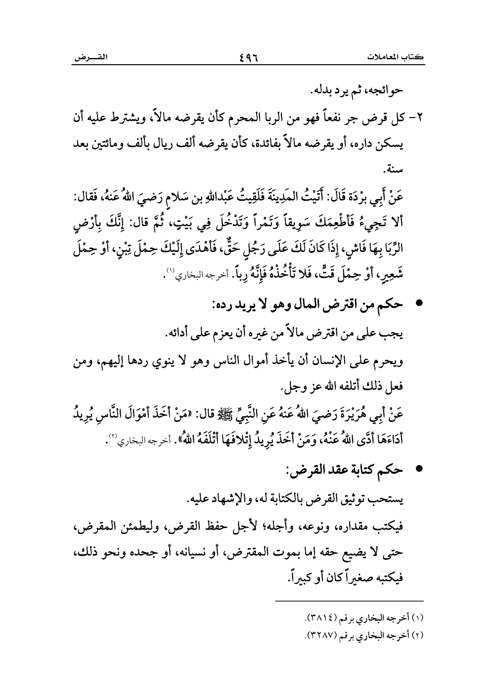 2 - كل قرض جر نفعاً فهو من الربا المحرم كأن يقرضه مالاً، ويشترط عليه أن يسكن داره، أو يقرضه مالاً بفائدة، كأن يقرضه ألف ريال بألف ومائتين بعد سنة.