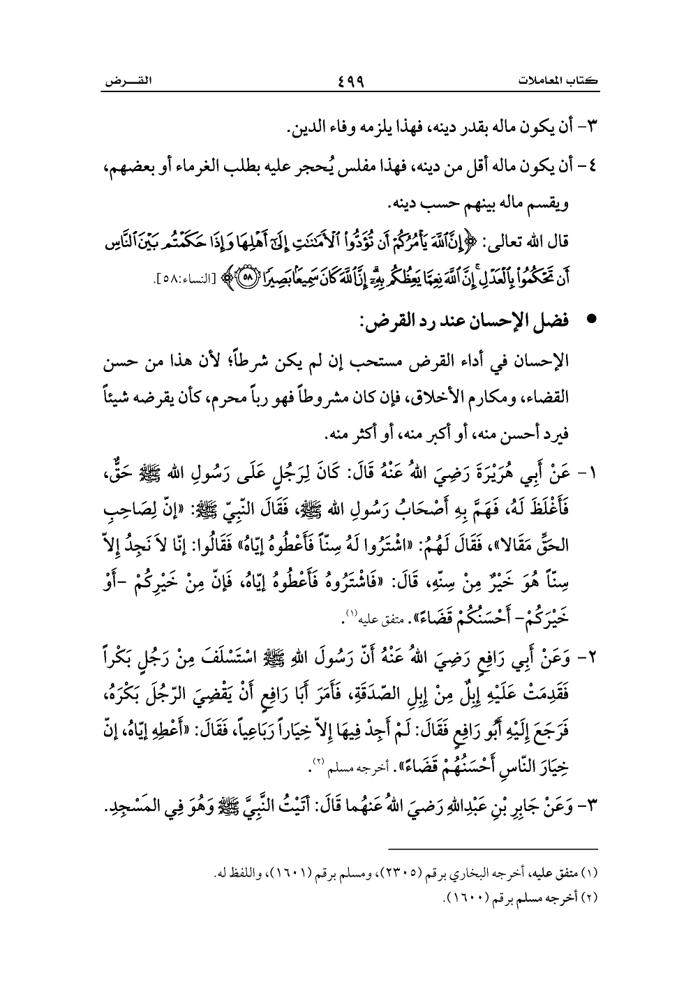 1 - عَنْ أَبِي هُرَيْرَةَ رَضِيَ اللهُ عَنْهُ قَالَ: كَانَ لِرَجُلٍ عَلَى رَسُولِ الله - صلى الله عليه وسلم - حَقٌّ، فَأَغْلَظَ لَهُ، فَهَمَّ بِهِ أَصْحَابُ رَسُولِ الله - صلى الله عليه وسلم -، فَقَالَ النّبِيّ - صلى الله عليه وسلم -: «إنّ لِصَاحِبِ الحَقِّ مَقَالا»، فَقَالَ لَهُمُ: «اشْتَرُوا لَهُ سِنّاً فَأَعْطُوهُ إيّاهُ» فَقَالُوا: إنّا لاَ نَجِدُ إِلاّ سِنّاً هُوَ خَيْرٌ مِنْ سِنّهِ، قَالَ: «فَاشْتَرُوهُ فَأَعْطُوهُ إيّاهُ، فَإنّ مِنْ خَيْرِكُمْ -أَوْ خَيْرَكُمْ- أَحْسَنُكُمْ قَضَاءً». متفق عليه (¬1).