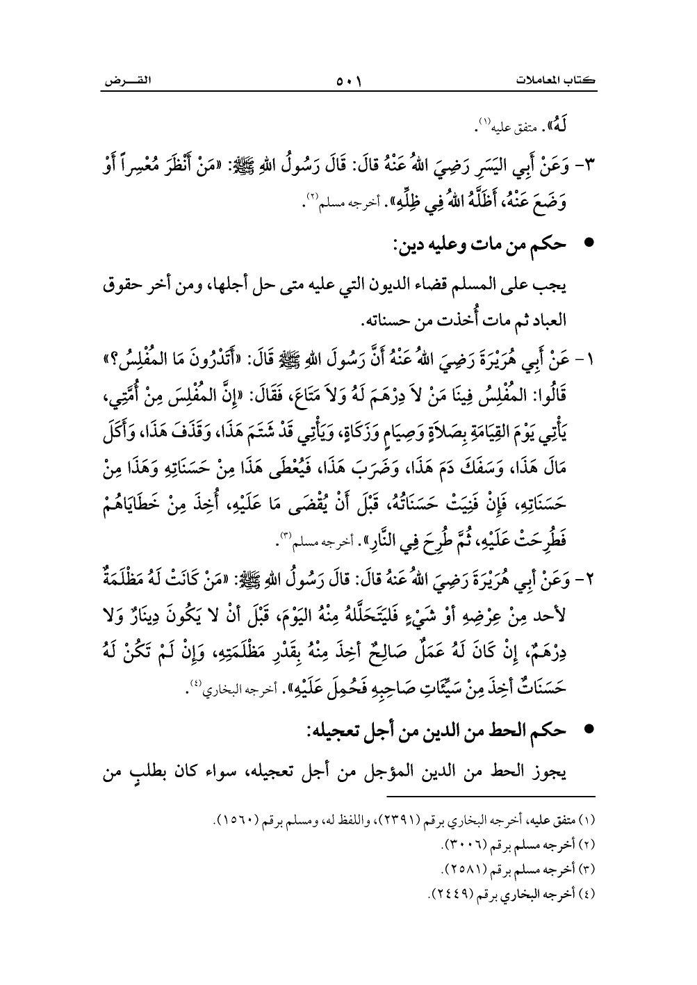 3 - وَعَنْ أَبِي اليَسَرِ رَضِيَ اللهُ عَنْهُ قالَ: قَالَ رَسُولُ اللهِ - صلى الله عليه وسلم -: «مَنْ أَنْظَرَ مُعْسِراً أَوْ وَضَعَ عَنْهُ، أَظَلَّهُ اللهُ فِي ظِلِّهِ». أخرجه مسلم (¬2).