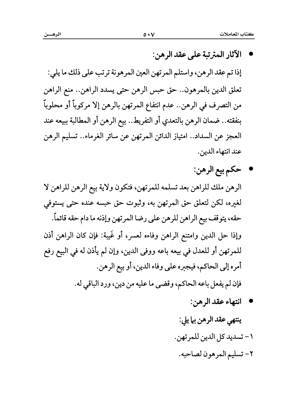 تعلق الدين بالمرهون .. حق حبس الرهن حتى يسدد الراهن .. منع الراهن من التصرف في الرهن .. عدم انتفاع المرتهن بالرهن إلا مركوباً أو محلوباً بنفقته .. ضمان الرهن بالتعدي أو التفريط .. بيع الرهن أو المطالبة ببيعه عند العجز عن السداد .. امتياز الدائن المرتهن عن سائر الغرماء .. تسليم الرهن عند انتهاء الدين.