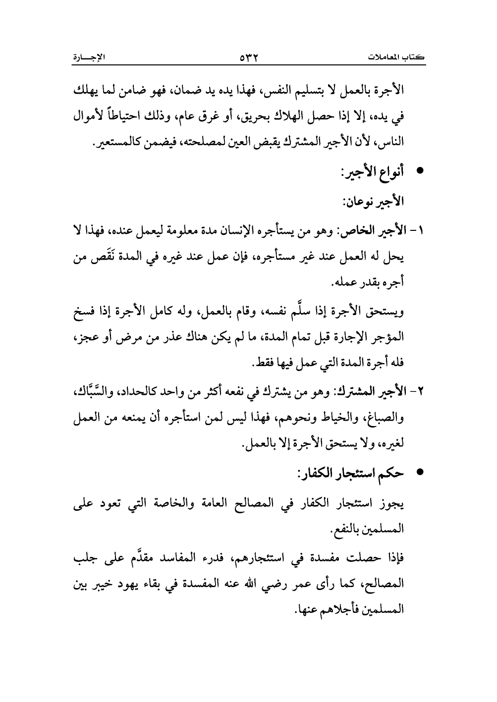 2 - الأجير المشترك: وهو من يشترك في نفعه أكثر من واحد كالحداد، والسَّبَّاك، والصباغ، والخياط ونحوهم، فهذا ليس لمن استأجره أن يمنعه من العمل لغيره، ولا يستحق الأجرة إلا بالعمل.