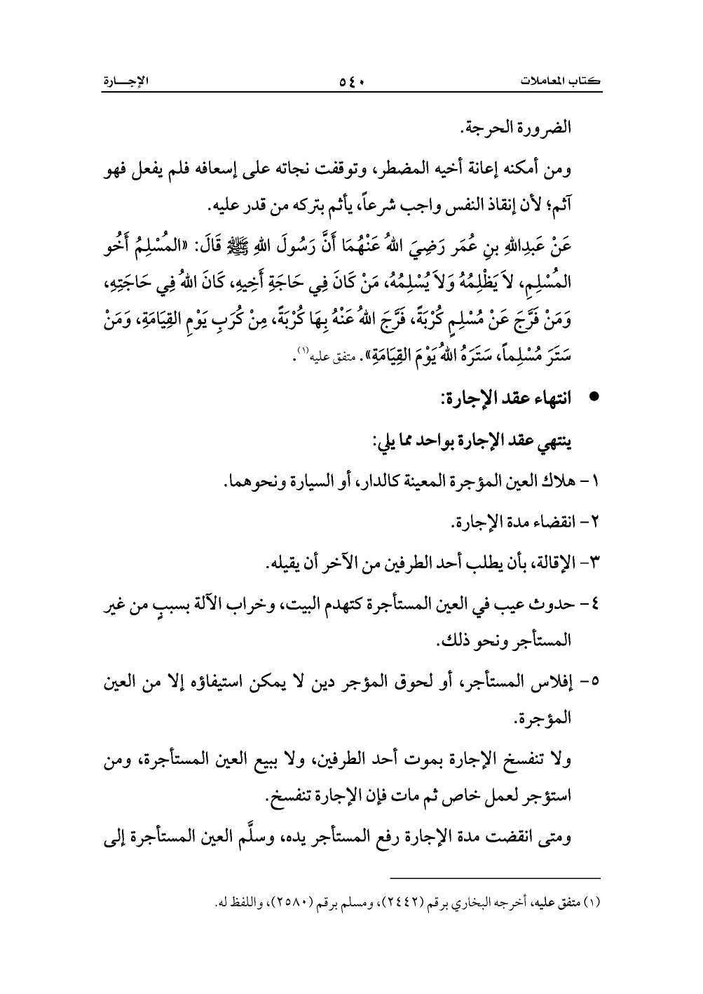 عَنْ عَبدِاللهِ بنِ عُمَر رَضِيَ اللهُ عَنْهُمَا أَنَّ رَسُولَ اللهِ - صلى الله عليه وسلم - قَالَ: «المُسْلِمُ أَخُو المُسْلِمِ، لاَ يَظْلِمُهُ وَلاَ يُسْلِمُهُ، مَنْ كَانَ فِي حَاجَةِ أَخِيهِ، كَانَ اللهُ فِي حَاجَتِهِ، وَمَنْ فَرَّجَ عَنْ مُسْلِمٍ كُرْبَةً، فَرَّجَ اللهُ عَنْهُ بِهَا كُرْبَةً، مِنْ كُرَبِ يَوْمِ القِيَامَةِ، وَمَنْ سَتَرَ مُسْلِماً، سَتَرَهُ اللهُ يَوْمَ القِيَامَةِ». متفق عليه (¬1).