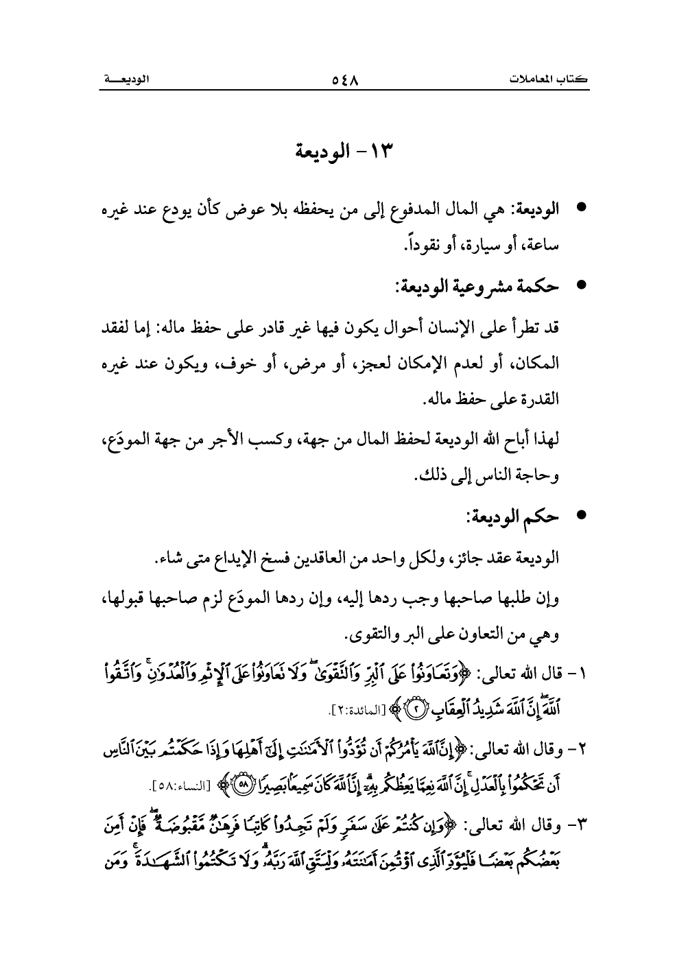 - الوديعة: هي المال المدفوع إلى من يحفظه بلا عوض كأن يودع عند غيره ساعة، أو سيارة، أو نقوداً.