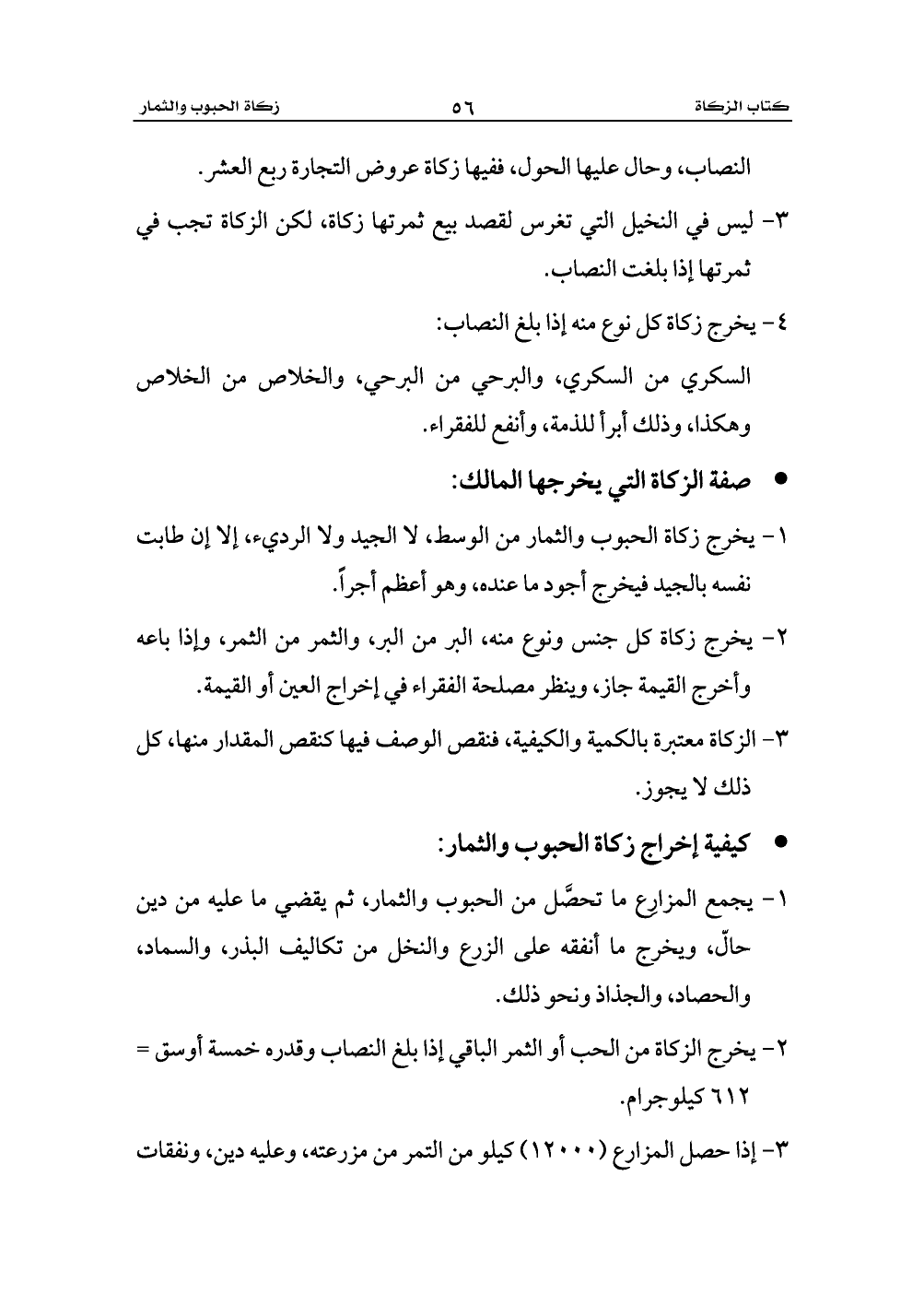2 - يخرج الزكاة من الحب أو الثمر الباقي إذا بلغ النصاب وقدره خمسة أوسق = 612 كيلوجرام.