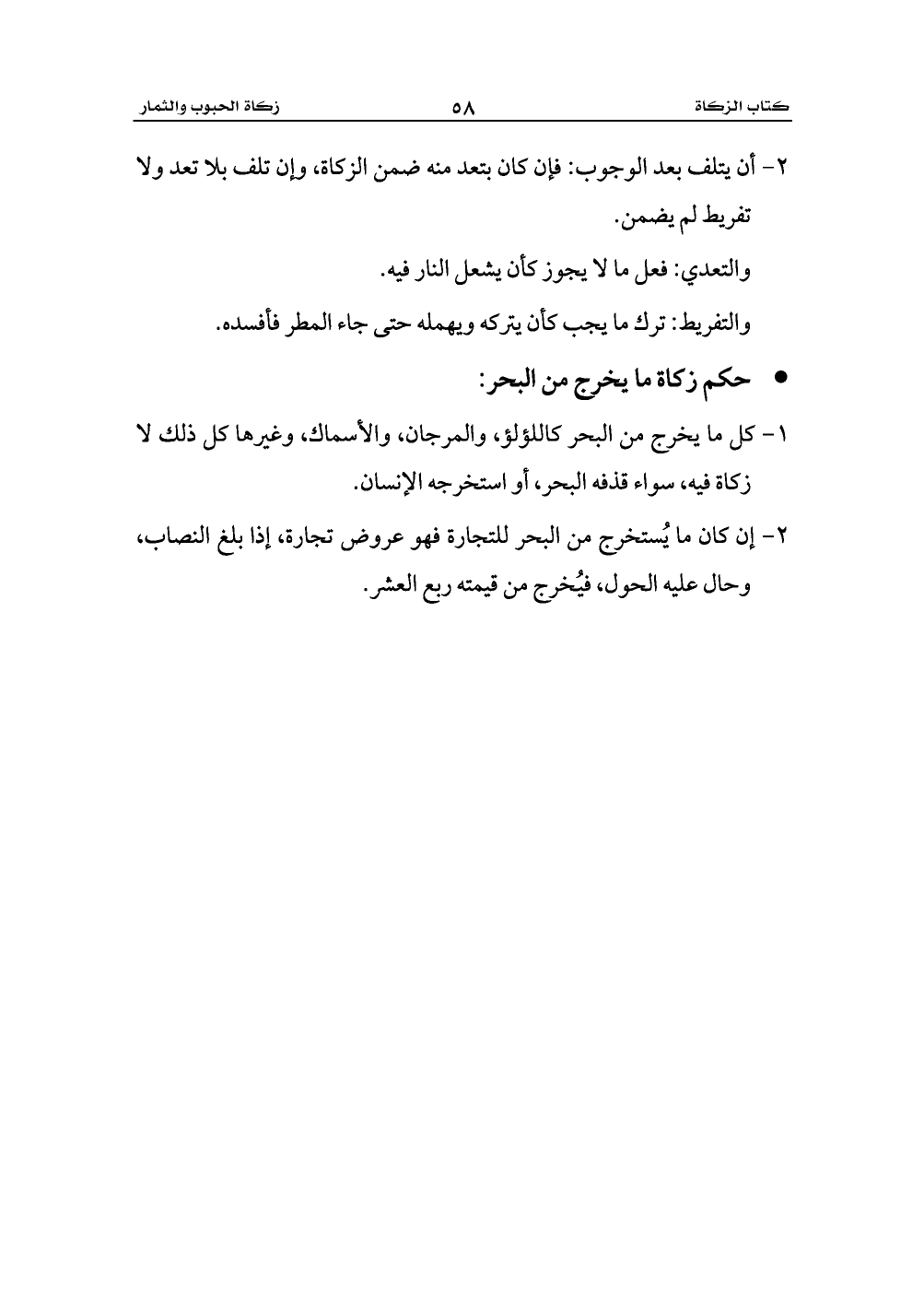 1 - كل ما يخرج من البحر كاللؤلؤ، والمرجان، والأسماك، وغيرها كل ذلك لا زكاة فيه، سواء قذفه البحر، أو استخرجه الإنسان.