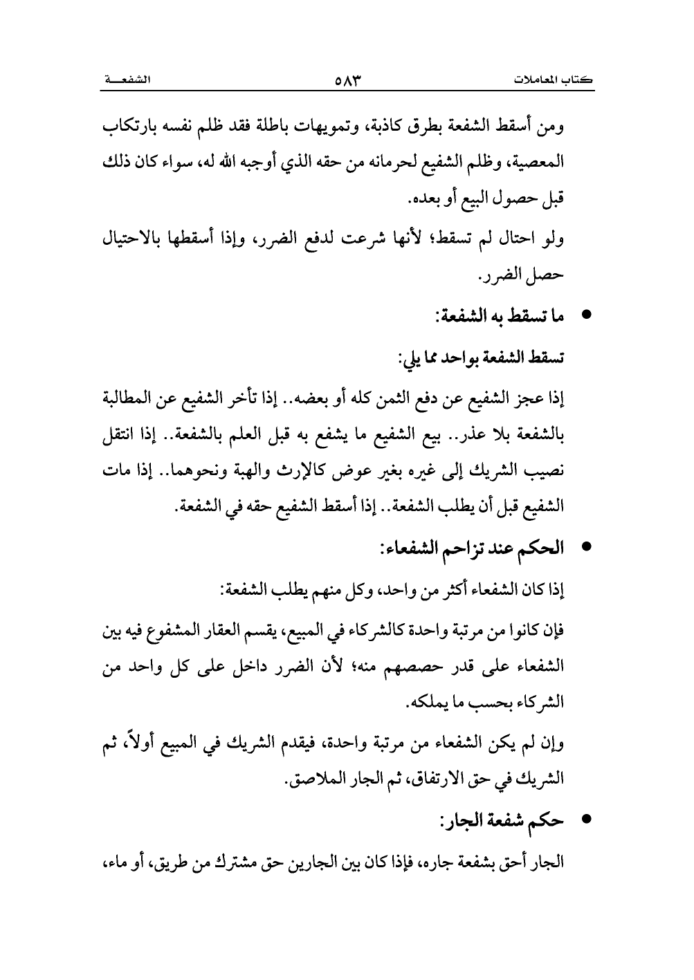 إذا عجز الشفيع عن دفع الثمن كله أو بعضه .. إذا تأخر الشفيع عن المطالبة بالشفعة بلا عذر .. بيع الشفيع ما يشفع به قبل العلم بالشفعة .. إذا انتقل نصيب الشريك إلى غيره بغير عوض كالإرث والهبة ونحوهما .. إذا مات الشفيع قبل أن يطلب الشفعة .. إذا أسقط الشفيع حقه في الشفعة.