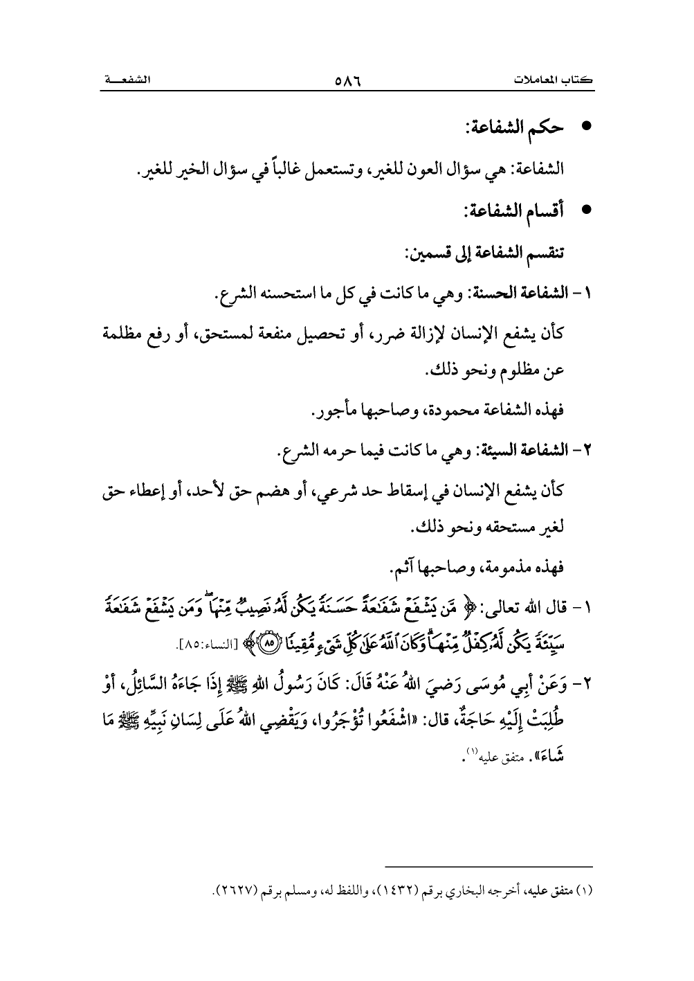 1 - قال الله تعالى: {مَنْ يَشْفَعْ شَفَاعَةً حَسَنَةً يَكُنْ لَهُ نَصِيبٌ مِنْهَا وَمَنْ يَشْفَعْ شَفَاعَةً سَيِّئَةً يَكُنْ لَهُ كِفْلٌ مِنْهَا وَكَانَ اللَّهُ عَلَى كُلِّ شَيْءٍ مُقِيتًا (85)} [النساء:85].
