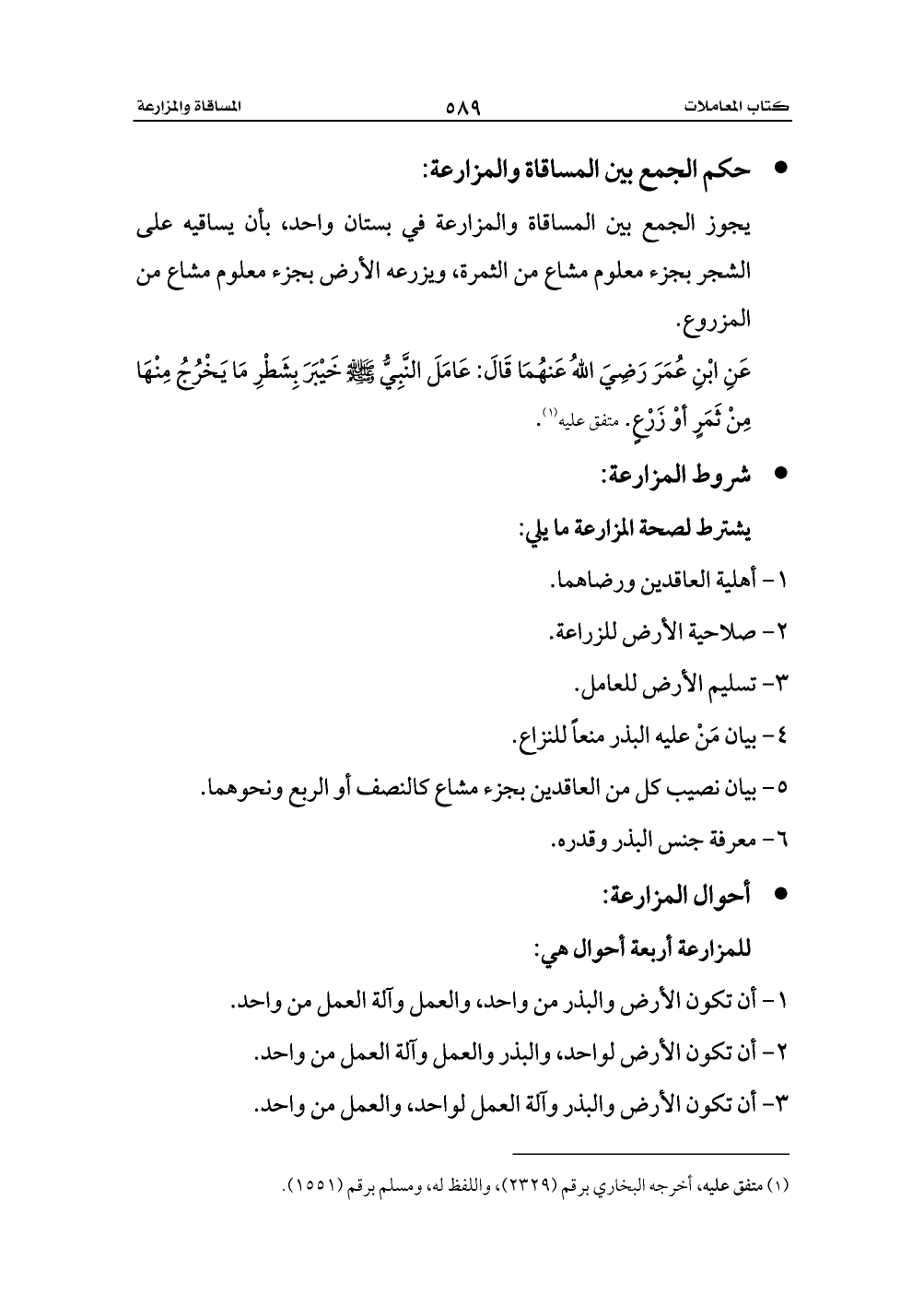 يجوز الجمع بين المساقاة والمزارعة في بستان واحد، بأن يساقيه على الشجر بجزء معلوم مشاع من الثمرة، ويزرعه الأرض بجزء معلوم مشاع من المزروع.