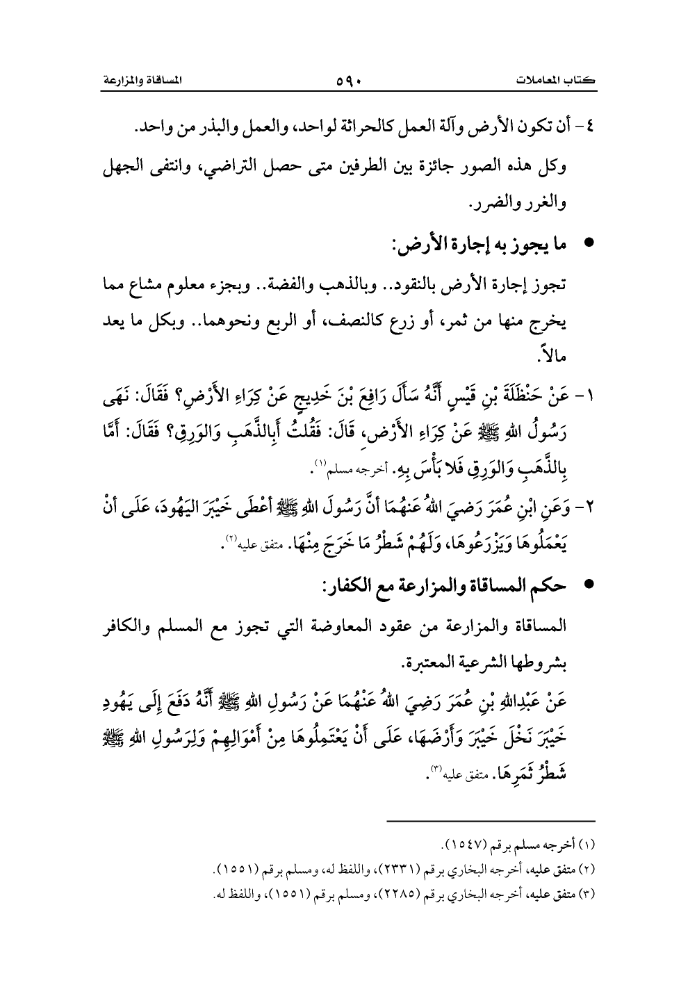 عَنْ عَبْدِاللهِ بْنِ عُمَرَ رَضِيَ اللهُ عَنْهُمَا عَنْ رَسُولِ اللهِ - صلى الله عليه وسلم - أَنَّهُ دَفَعَ إِلَى يَهُودِ خَيْبَرَ نَخْلَ خَيْبَرَ وَأَرْضَهَا، عَلَى أَنْ يَعْتَمِلُوهَا مِنْ أَمْوَالِهِمْ وَلِرَسُولِ اللهِ - صلى الله عليه وسلم -