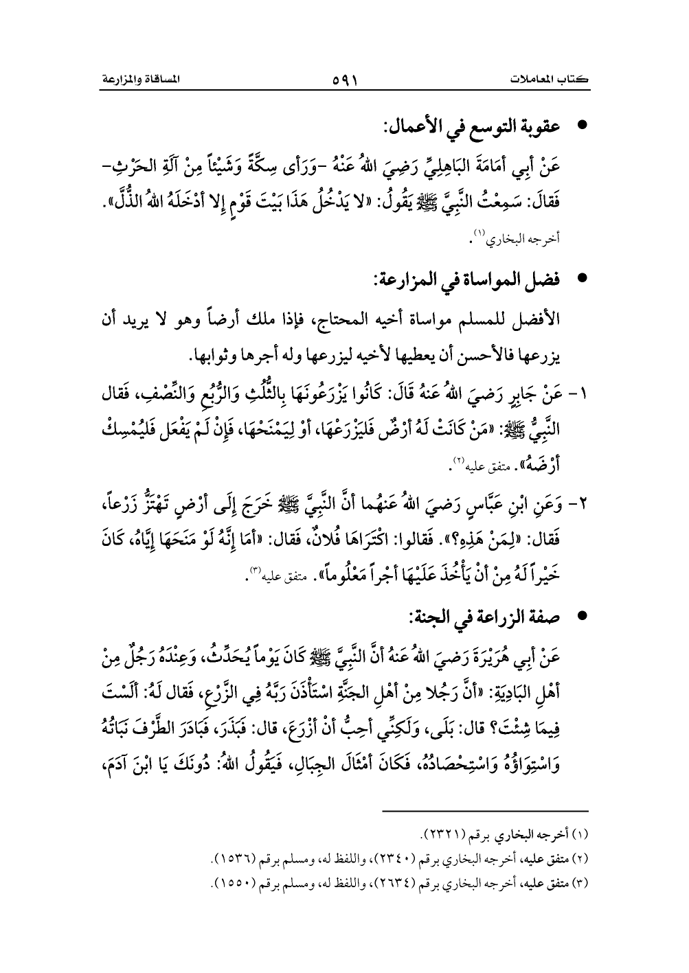 1 - عَنْ جَابِرٍ رَضيَ اللهُ عَنهُ قَالَ: كَانُوا يَزْرَعُونَهَا بِالثُّلُثِ وَالرُّبُعِ وَالنِّصْفِ، فَقال النَّبِيُّ - صلى الله عليه وسلم -: «مَنْ كَانَتْ لَهُ أرْضٌ فَليَزْرَعْهَا، أوْ لِيَمْنَحْهَا، فَإِنْ لَمْ يَفْعَل فَليُمْسِكْ أرْضَهُ». متفق عليه (¬2).