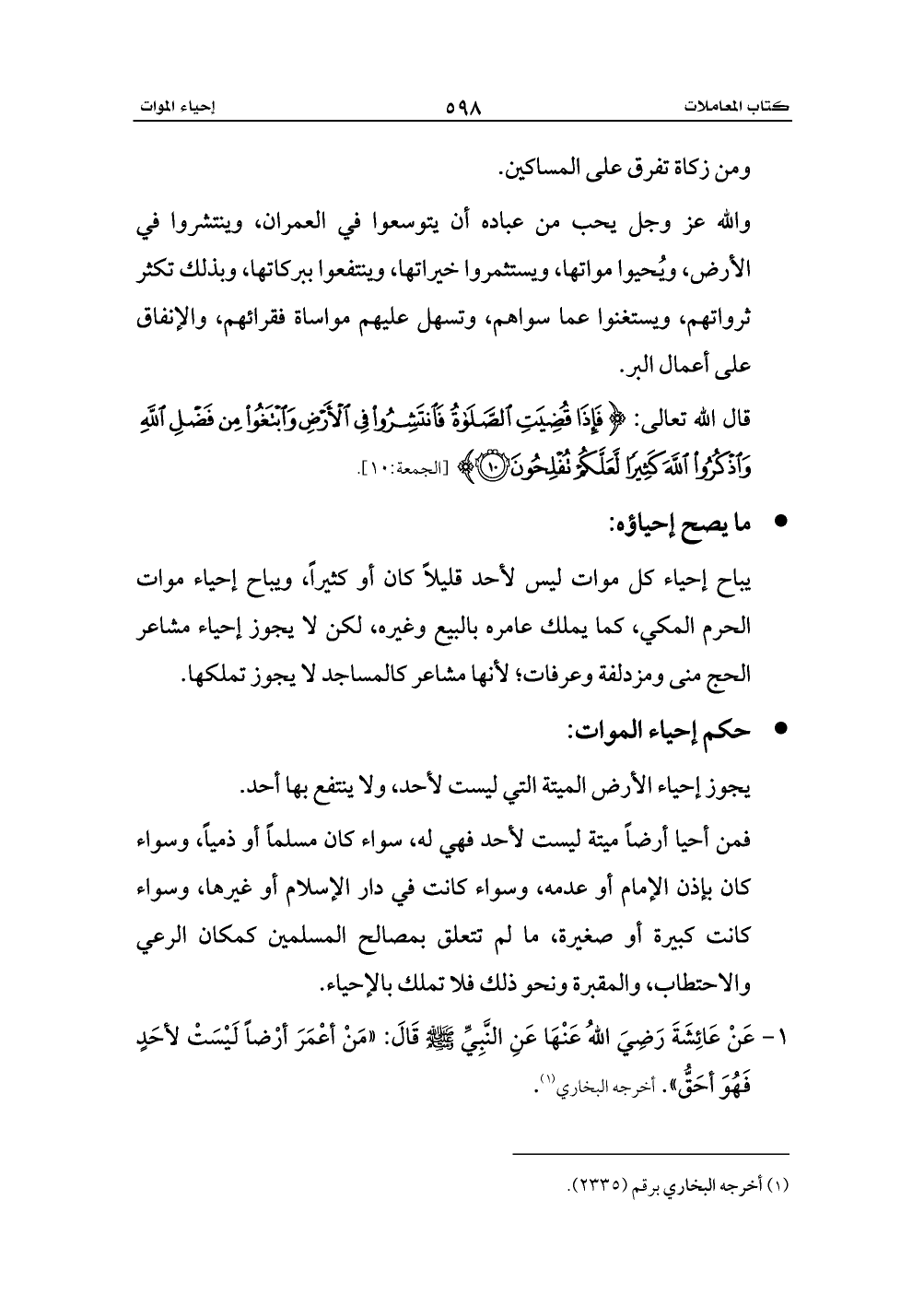 فمن أحيا أرضاً ميتة ليست لأحد فهي له، سواء كان مسلماً أو ذمياً، وسواء كان بإذن الإمام أو عدمه، وسواء كانت في دار الإسلام أو غيرها، وسواء كانت كبيرة أو صغيرة، ما لم تتعلق بمصالح المسلمين كمكان الرعي والاحتطاب، والمقبرة ونحو ذلك فلا تملك بالإحياء.