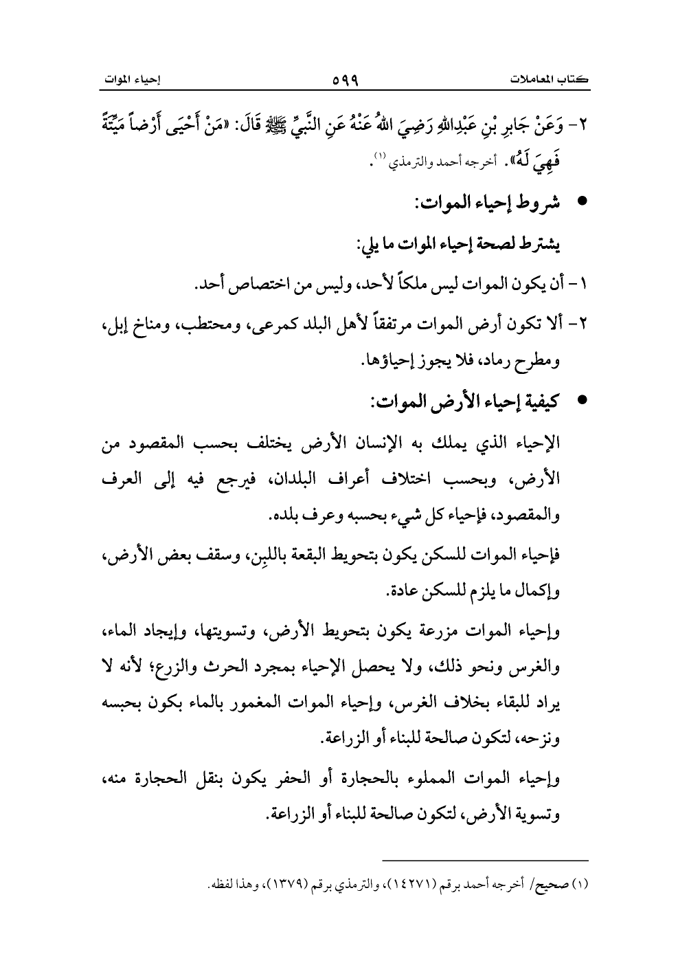 2 - وَعَنْ جَابرِ بْنِ عَبْدِاللهِ رَضِيَ اللهُ عَنْهُ عَنِ النَّبيِّ - صلى الله عليه وسلم - قَالَ: «مَنْ أَحْيَى أَرْضاً مَيِّتَةً فَهِيَ لَهُ». أخرجه أحمد والترمذي (¬1).