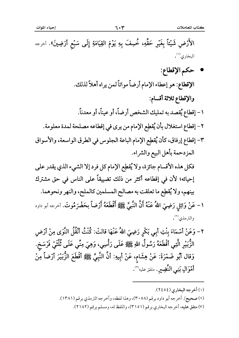 1 - عَنْ وَائِلٍ رَضِيَ اللهُ عَنْهُ أَنَّ النَّبيَّ - صلى الله عليه وسلم - أَقْطَعَهُ أَرْضاً بحَضْرَمُوتَ. أخرجه أبو داود والترمذي (¬2).