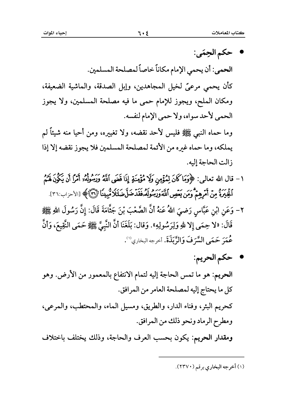 وما حماه النبي - صلى الله عليه وسلم - فليس لأحد نقضه، ولا تغييره، ومن أحيا منه شيئاً لم يملكه، وما حماه غيره من الأئمة لمصلحة المسلمين فلا يجوز نقضه إلا إذا زالت الحاجة إليه.