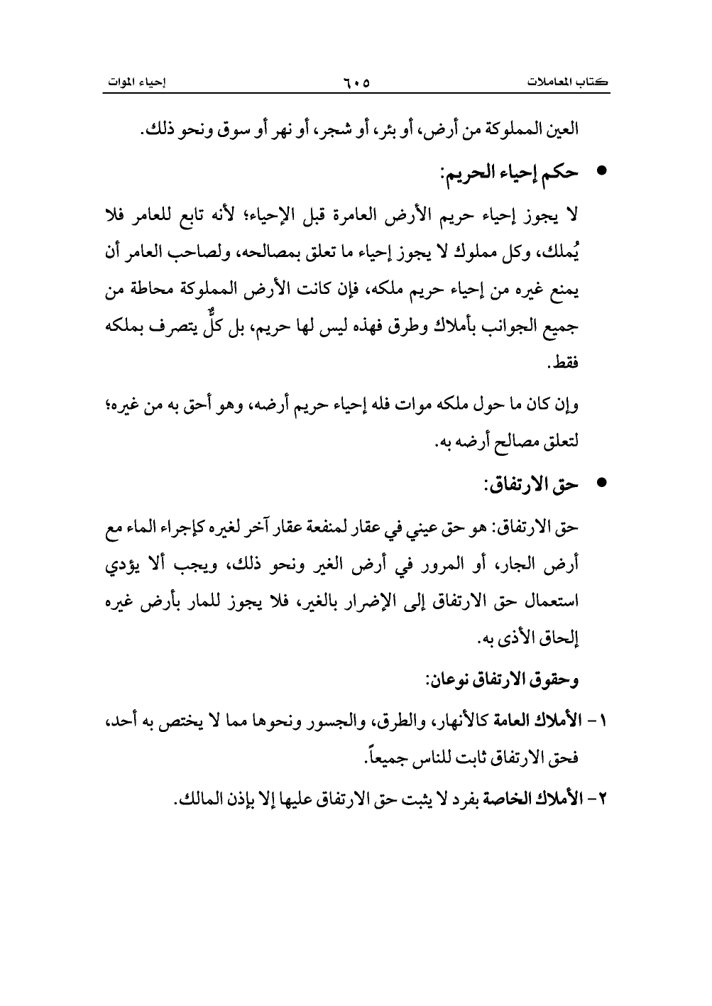 حق الارتفاق: هو حق عيني في عقار لمنفعة عقار آخر لغيره كإجراء الماء مع أرض الجار، أو المرور في أرض الغير ونحو ذلك، ويجب ألا يؤدي استعمال حق الارتفاق إلى الإضرار بالغير، فلا يجوز للمار بأرض غيره إلحاق الأذى به.