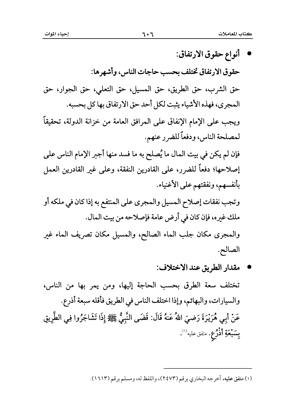عَنْ أبِي هُرَيْرَةَ رَضيَ اللهُ عَنهُ قَالَ: قَضَى النَّبِيُّ - صلى الله عليه وسلم - إِذَا تَشَاجَرُوا فِي الطَّرِيقِ بِسَبْعَةِ أذْرُعٍ. متفق عليه (¬1).