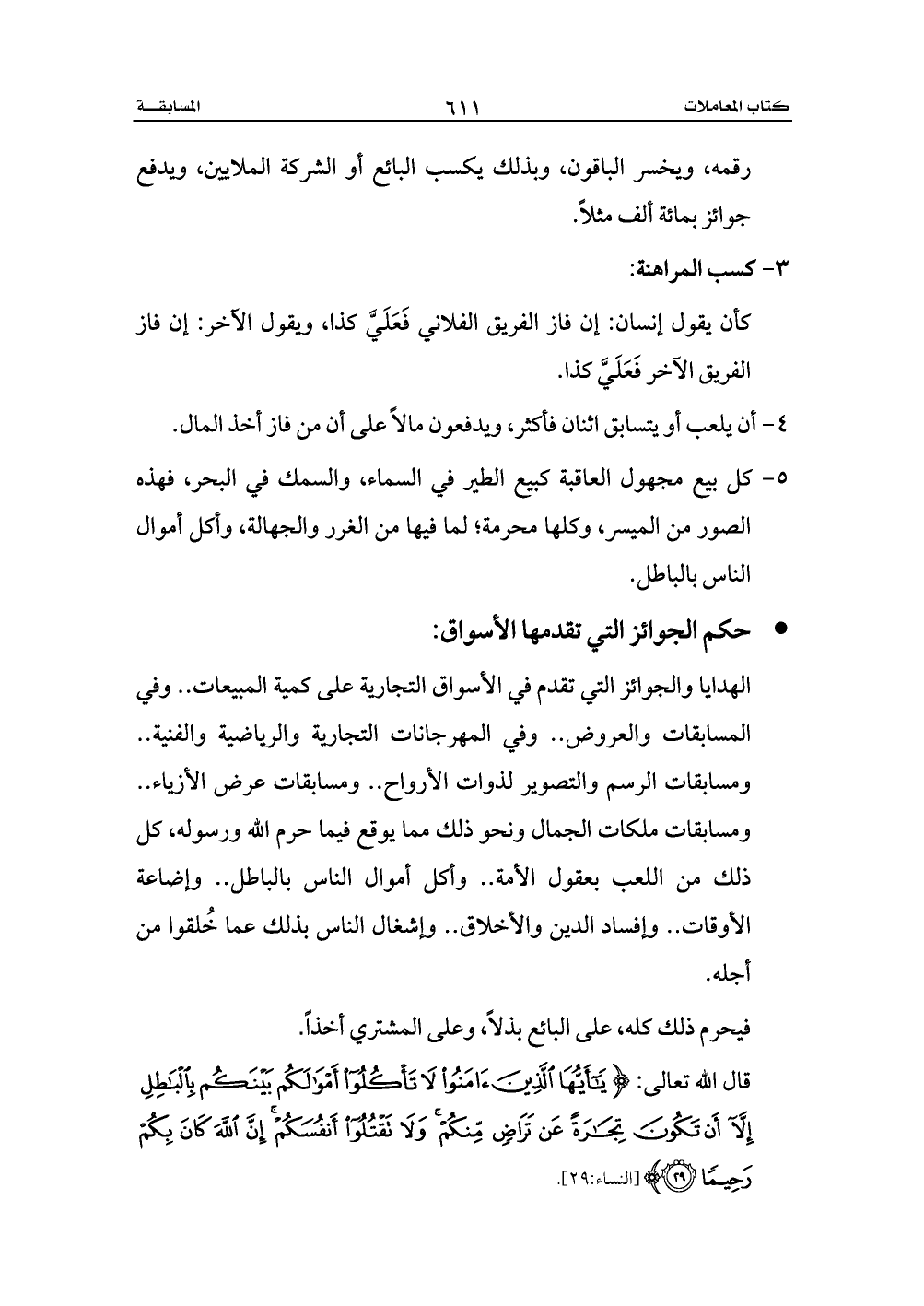 الهدايا والجوائز التي تقدم في الأسواق التجارية على كمية المبيعات .. وفي المسابقات والعروض .. وفي المهرجانات التجارية والرياضية والفنية .. ومسابقات الرسم والتصوير لذوات الأرواح .. ومسابقات عرض الأزياء .. ومسابقات ملكات الجمال ونحو ذلك مما يوقع فيما حرم الله ورسوله، كل ذلك من اللعب بعقول الأمة .. وأكل أموال الناس بالباطل .. وإضاعة الأوقات .. وإفساد الدين والأخلاق .. وإشغال الناس بذلك عما خُلقوا من أجله.