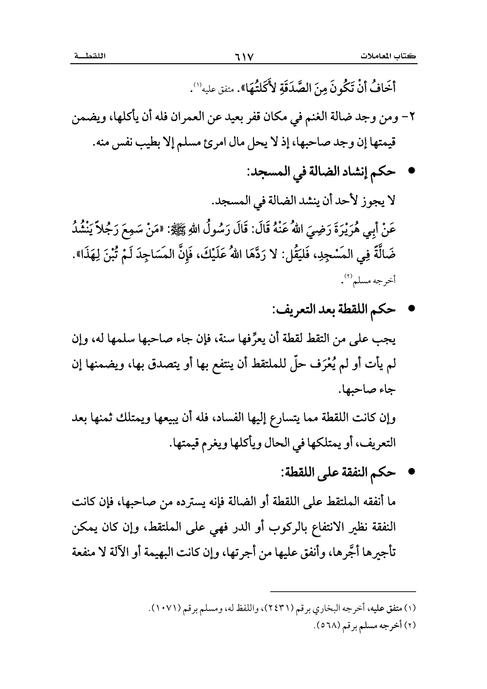 2 - ومن وجد ضالة الغنم في مكان قفر بعيد عن العمران فله أن يأكلها، ويضمن قيمتها إن وجد صاحبها، إذ لا يحل مال امرئ مسلم إلا بطيب نفس منه.