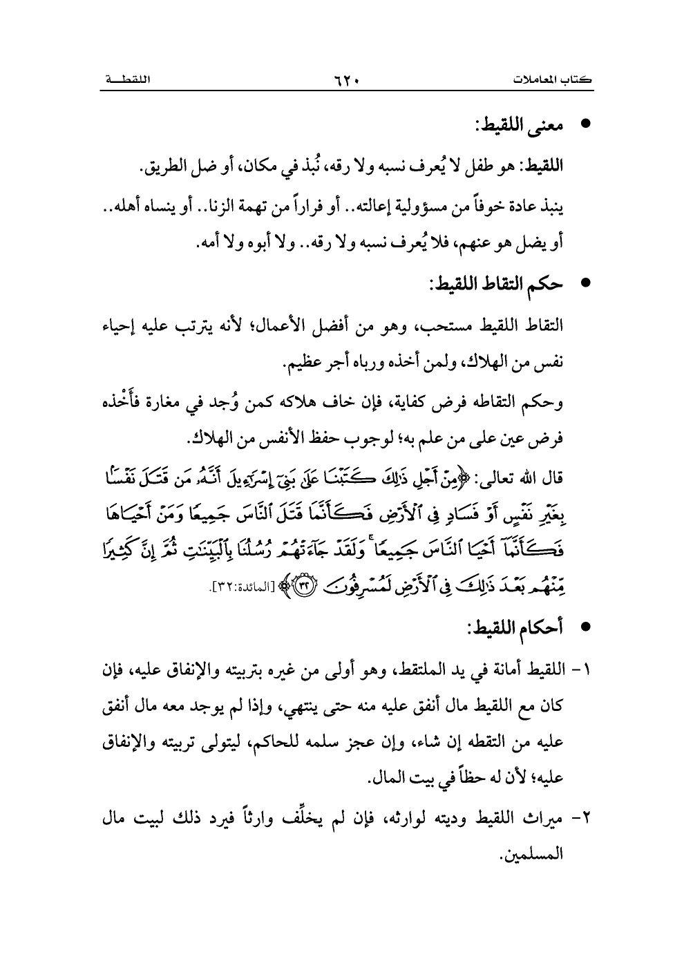 اللقيط: هو طفل لا يُعرف نسبه ولا رقه، نُبذ في مكان، أو ضل الطريق.