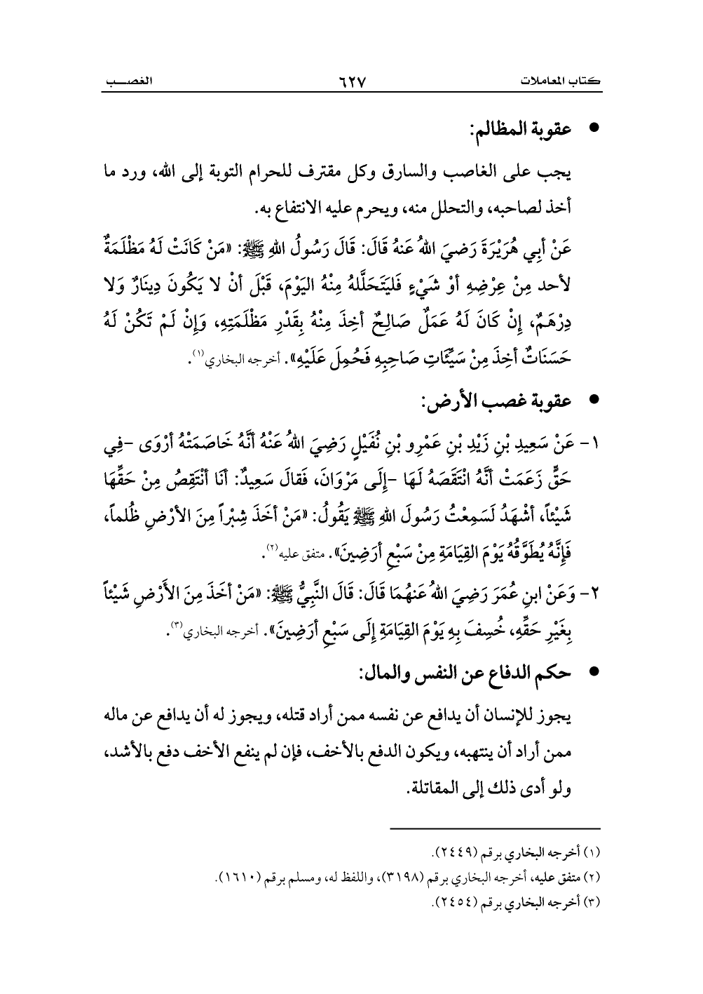 2 - وَعَنْ ابنِ عُمَرَ رَضِيَ اللهُ عَنهُمَا قَالَ: قَالَ النَّبِيُّ - صلى الله عليه وسلم -: «مَنْ أخَذَ مِنَ الأَرْضِ شَيْئاً بِغَيْرِ حَقِّهِ، خُسِفَ بِهِ يَوْمَ القِيَامَةِ إِلَى سَبْعِ أرَضِينَ». أخرجه البخاري (¬3).