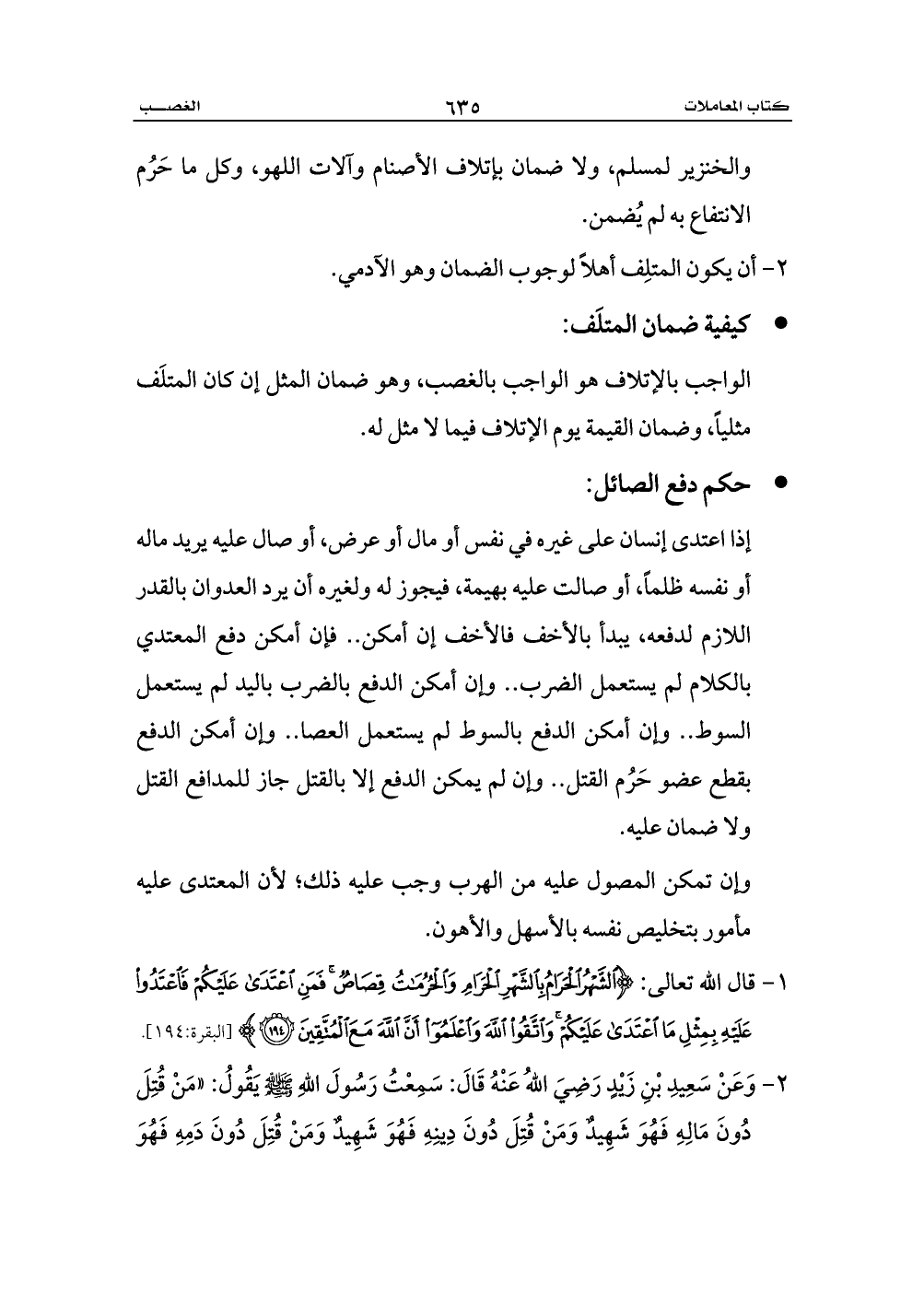 إذا اعتدى إنسان على غيره في نفس أو مال أو عرض، أو صال عليه يريد ماله أو نفسه ظلماً، أو صالت عليه بهيمة، فيجوز له ولغيره أن يرد العدوان بالقدر اللازم لدفعه، يبدأ بالأخف فالأخف إن أمكن .. فإن أمكن دفع المعتدي بالكلام لم يستعمل الضرب .. وإن أمكن الدفع بالضرب باليد لم يستعمل السوط .. وإن أمكن الدفع بالسوط لم يستعمل العصا .. وإن أمكن الدفع بقطع عضو حَرُم القتل .. وإن لم يمكن الدفع إلا بالقتل جاز للمدافع القتل ولا ضمان عليه.