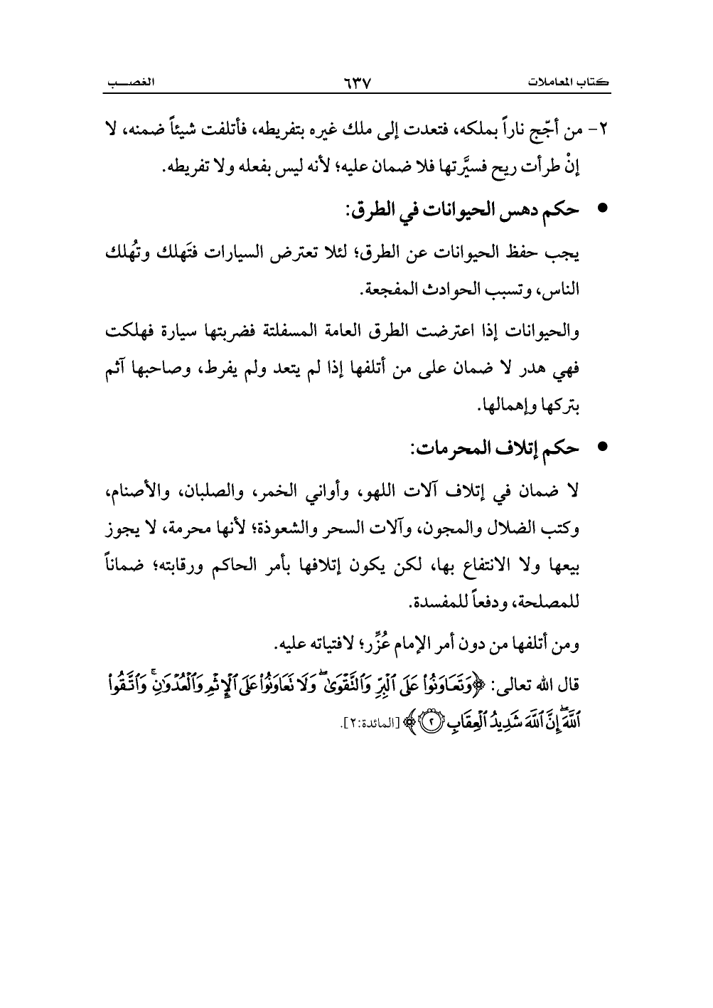 2 - من أجّج ناراً بملكه، فتعدت إلى ملك غيره بتفريطه، فأتلفت شيئاً ضمنه، لا إنْ طرأت ريح فسيَّرتها فلا ضمان عليه؛ لأنه ليس بفعله ولا تفريطه.