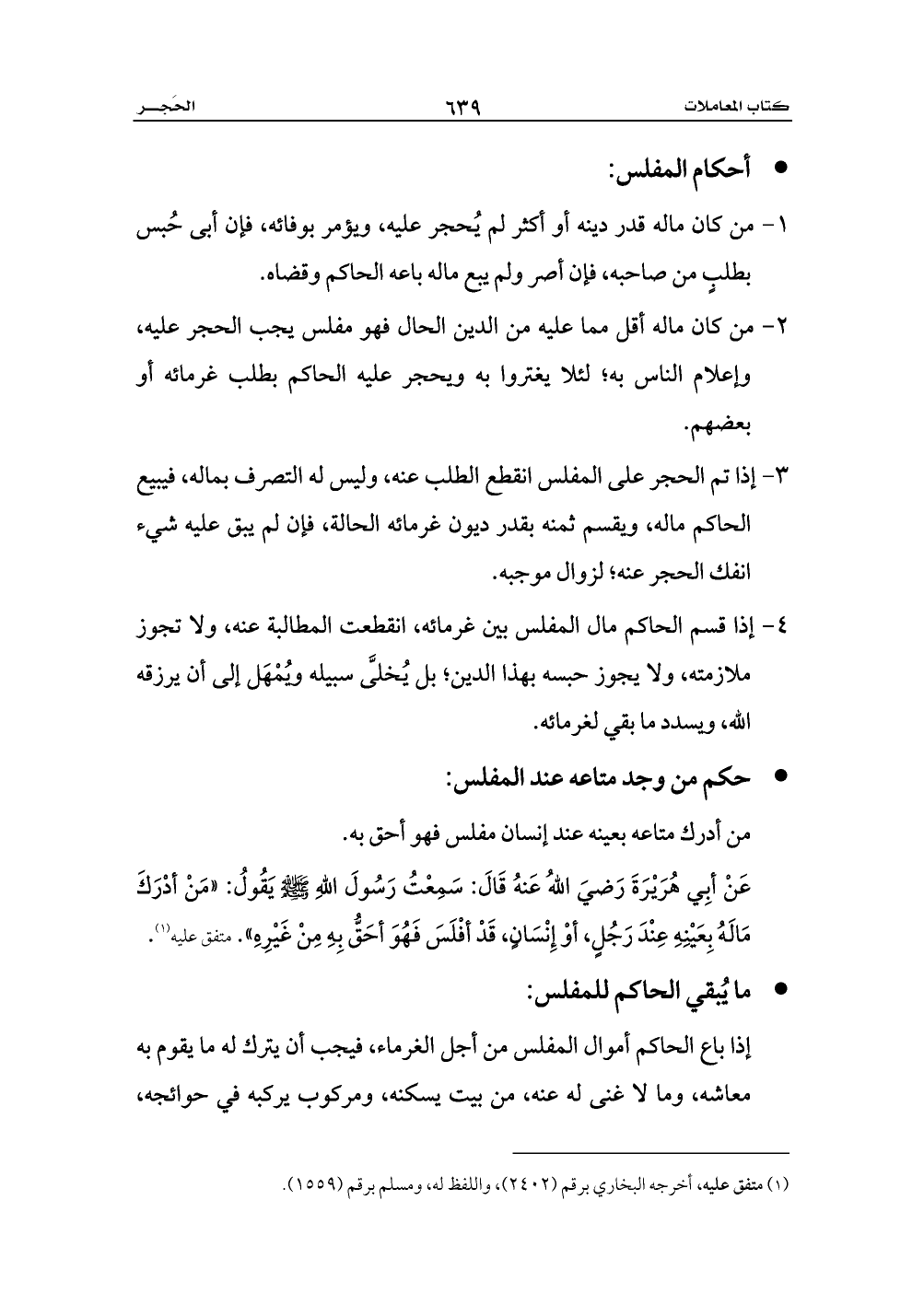 2 - من كان ماله أقل مما عليه من الدين الحال فهو مفلس يجب الحجر عليه، وإعلام الناس به؛ لئلا يغتروا به ويحجر عليه الحاكم بطلب غرمائه أو بعضهم.