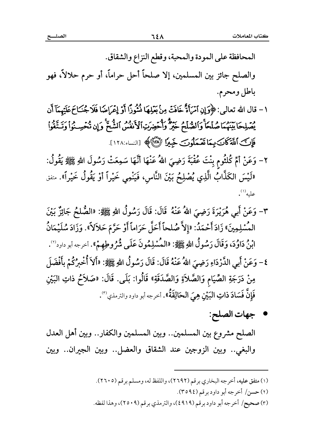 3 - وَعَنْ أَبي هُرَيْرَةَ رَضِيَ اللهُ عَنْهُ قَالَ: قَالَ رَسُولُ اللهِ - صلى الله عليه وسلم -: «الصُّلحُ جَائِزٌ بَيْنَ المُسْلِمِينَ» زَادَ أَحْمَدُ: «إِلاَّ صُلحاً أَحَلَّ حَرَاماً أَوْ حَرَّمَ حَلاَلاً». وَزَادَ سُلَيْمَانُ ابْنُ دَاوُدَ، وَقَالَ رَسُولُ اللهِ - صلى الله عليه وسلم -: «المُسْلِمُونَ عَلَى شُرُوطِهِمْ». أخرجه أبو داود (¬2).