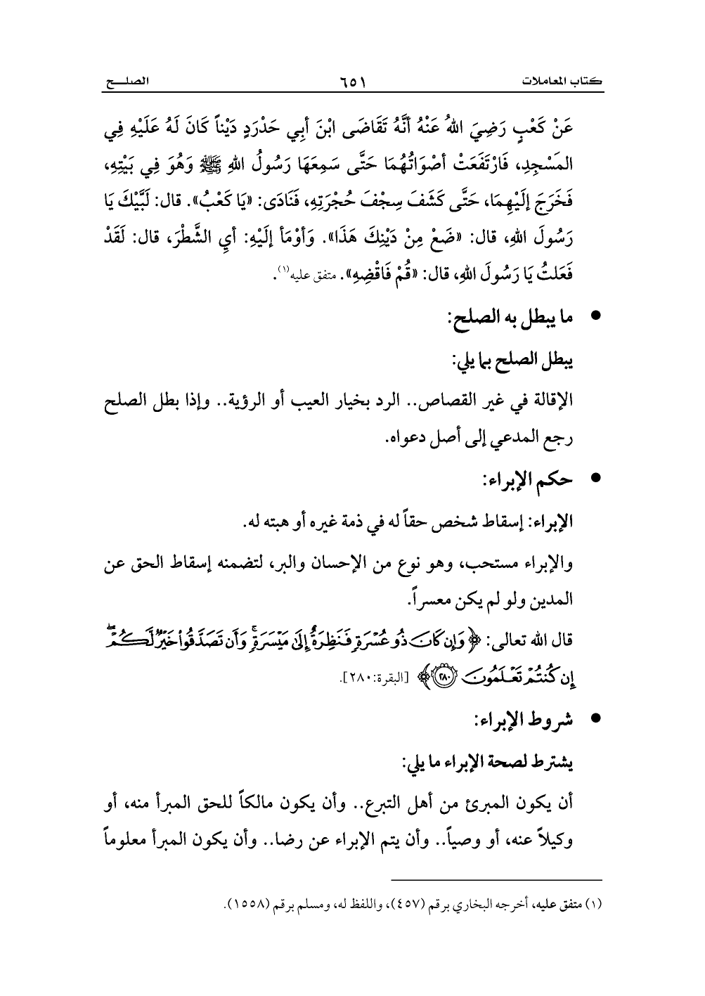 عَنْ كَعْبٍ رَضِيَ اللهُ عَنْهُ أنَّهُ تَقَاضَى ابْنَ أبِي حَدْرَدٍ دَيْناً كَانَ لَهُ عَلَيْهِ فِي المَسْجِدِ، فَارْتَفَعَتْ أصْوَاتُهُمَا حَتَّى سَمِعَهَا رَسُولُ اللهِ - صلى الله عليه وسلم - وَهُوَ فِي بَيْتِهِ، فَخَرَجَ إلَيْهِمَا، حَتَّى كَشَفَ سِجْفَ حُجْرَتِهِ، فَنَادَى: «يَا كَعْبُ». قال: لَبَّيْكَ يَا رَسُولَ اللهِ، قال: «ضَعْ مِنْ دَيْنِكَ هَذَا». وَأوْمَأ إلَيْهِ: أيِ الشَّطْرَ، قال: لَقَدْ فَعَلتُ يَا رَسُولَ اللهِ، قال: «قُمْ فَاقْضِهِ». متفق عليه (¬1).