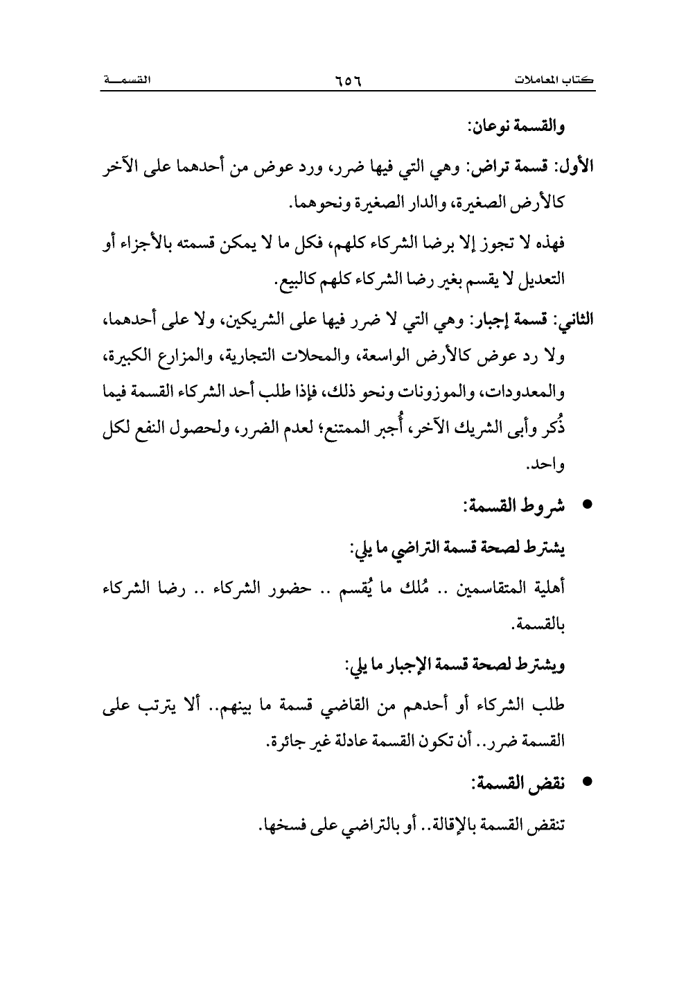 الثاني: قسمة إجبار: وهي التي لا ضرر فيها على الشريكين، ولا على أحدهما، ولا رد عوض كالأرض الواسعة، والمحلات التجارية، والمزارع الكبيرة، والمعدودات، والموزونات ونحو ذلك، فإذا طلب أحد الشركاء القسمة فيما ذُكر وأبى الشريك الآخر، أُجبر الممتنع؛ لعدم الضرر، ولحصول النفع لكل واحد.