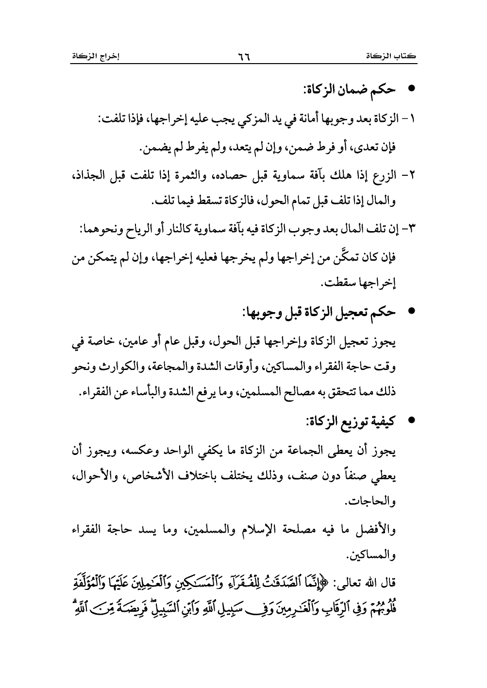 1 - الزكاة بعد وجوبها أمانة في يد المزكي يجب عليه إخراجها، فإذا تلفت: