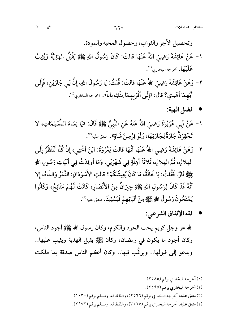 1 - عَنْ أبِي هُرَيْرَةَ رَضيَ اللهُ عَنهُ عَنِ النَّبِيِّ - صلى الله عليه وسلم - قَالَ: «يَا نِسَاءَ المُسْلِمَاتِ، لا تَحْقِرَنَّ جَارَةٌ لِجَارَتِهَا، وَلَوْ فِرْسِنَ شَاةٍ». متفق عليه (¬3).