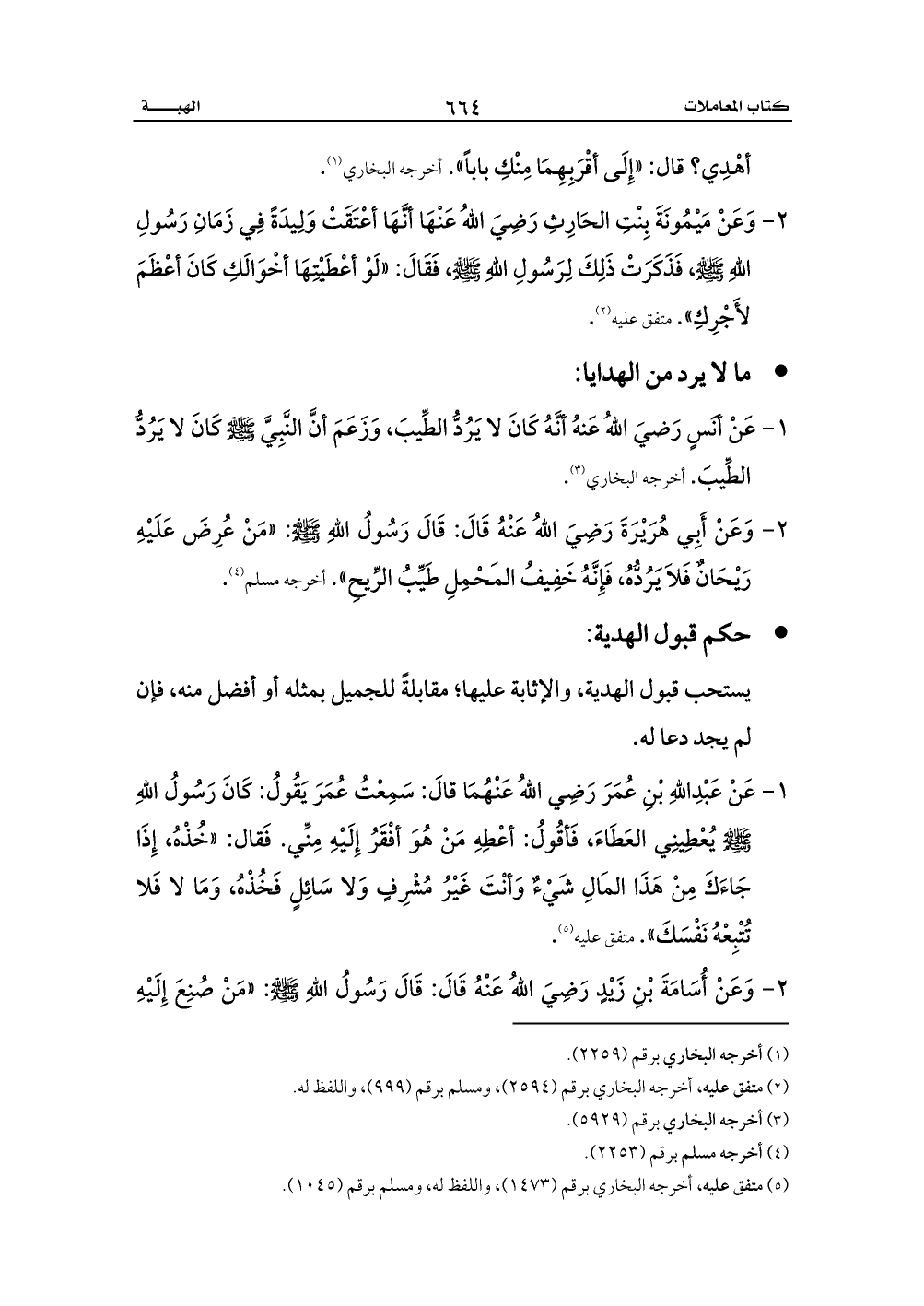 1 - عَنْ أنَسٍ رَضيَ اللهُ عَنهُ أنَّهُ كَانَ لا يَرُدُّ الطِّيبَ، وَزَعَمَ أنَّ النَّبِيَّ - صلى الله عليه وسلم - كَانَ لا يَرُدُّ الطِّيبَ. أخرجه البخاري (¬3).