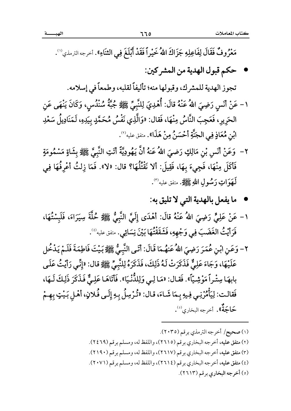 تجوز الهدية للمشرك، وقبولها منه؛ تأليفاً لقلبه، وطمعاً في إسلامه.
