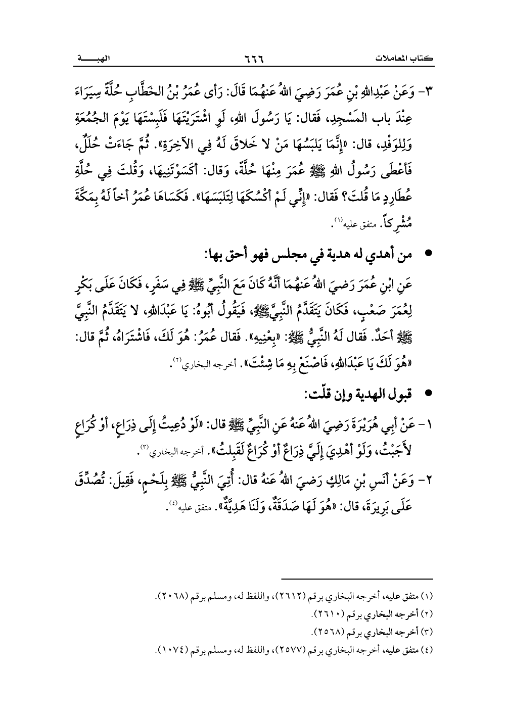3 - وَعَنْ عَبْدِاللهِ بْنِ عُمَرَ رَضِيَ اللهُ عَنهُمَا قَالَ: رَأى عُمَرُ بْنُ الخَطَّابِ حُلَّةً سِيَرَاءَ عِنْدَ باب المَسْجِدِ، فَقال: يَا رَسُولَ اللهِ، لَوِ اشْتَرَيْتَهَا فَلَبِسْتَهَا يَوْمَ الجُمُعَةِ وَلِلوَفْدِ، قال: «إِنَّمَا يَلبَسُهَا مَنْ لا خَلاقَ لَهُ فِي الآخِرَةِ». ثُمَّ جَاءَتْ حُلَلٌ، فَأعْطَى رَسُولُ اللهِ - صلى الله عليه وسلم - عُمَرَ مِنْهَا حُلَّةً، وَقال: أكَسَوْتَنِيهَا، وَقُلتَ فِي حُلَّةِ عُطَارِدٍ مَا قُلتَ؟ فَقال: «إِنِّي لَمْ أكْسُكَهَا لِتَلبَسَهَا». فَكَسَاهَا عُمَرُ أخاً لَهُ بِمَكَّةَ مُشْرِكاً. متفق عليه (¬1).
