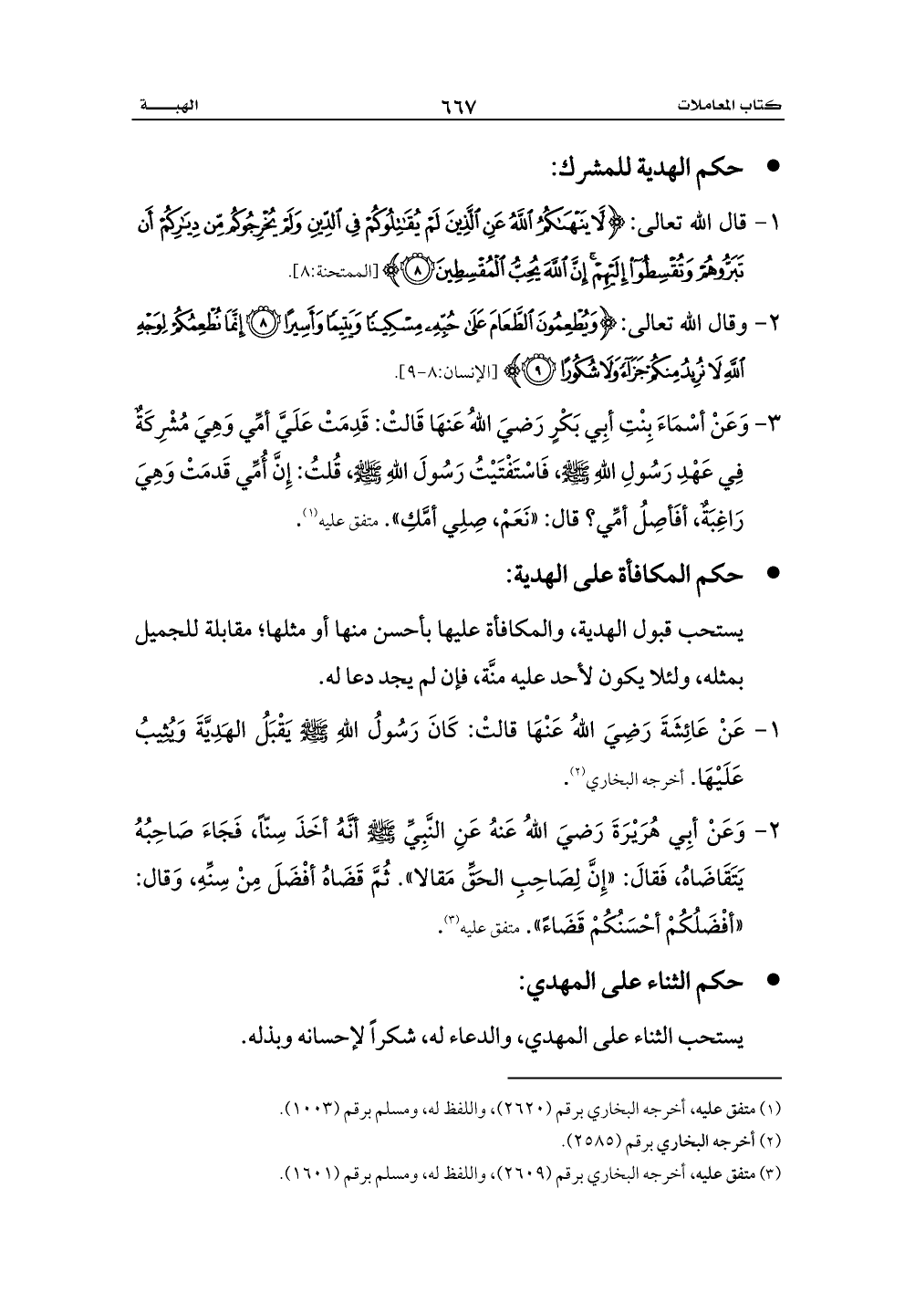 3 - وَعَنْ أسْمَاءَ بِنْتِ أبِي بَكْرٍ رَضيَ اللهُ عَنهَا قَالتْ: قَدِمَتْ عَلَيَّ أمِّي وَهِيَ مُشْرِكَةٌ فِي عَهْدِ رَسُولِ اللهِ - صلى الله عليه وسلم -، فَاسْتَفْتَيْتُ رَسُولَ اللهِ - صلى الله عليه وسلم -، قُلتُ: إِنَّ أُمِّي قَدمَتْ وَهِيَ رَاغِبَةٌ، أفَأصِلُ أمِّي؟ قال: «نَعَمْ، صِلِي أمَّكِ». متفق عليه (¬1).