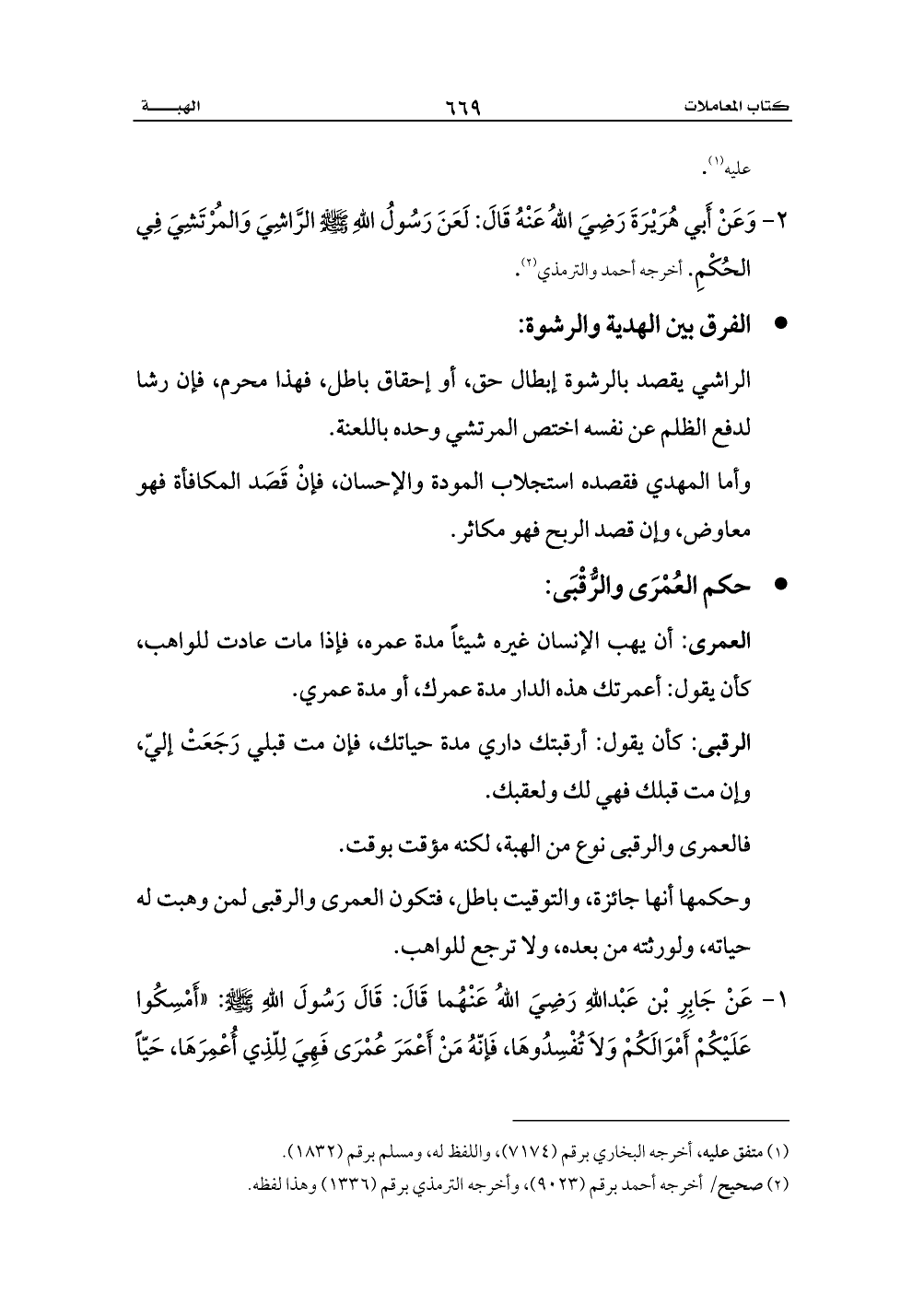 2 - وَعَنْ أَبي هُرَيْرَةَ رَضِيَ اللهُ عَنْهُ قَالَ: لَعَنَ رَسُولُ اللهِ - صلى الله عليه وسلم - الرَّاشِيَ وَالمُرْتَشِيَ فِي الحُكْمِ. أخرجه أحمد والترمذي (¬2).