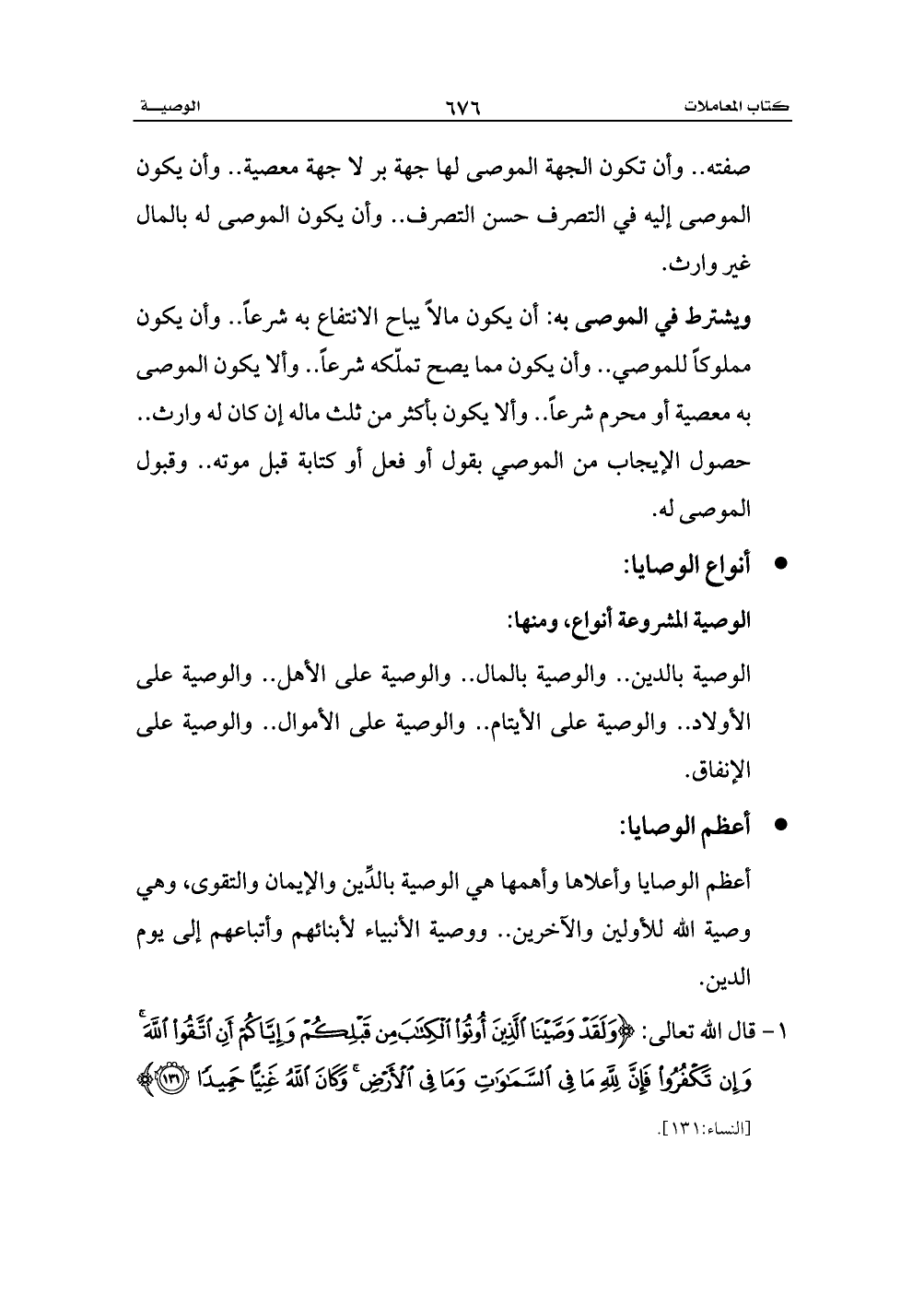 صفته .. وأن تكون الجهة الموصى لها جهة بر لا جهة معصية .. وأن يكون الموصى إليه في التصرف حسن التصرف .. وأن يكون الموصى له بالمال غير وارث.
