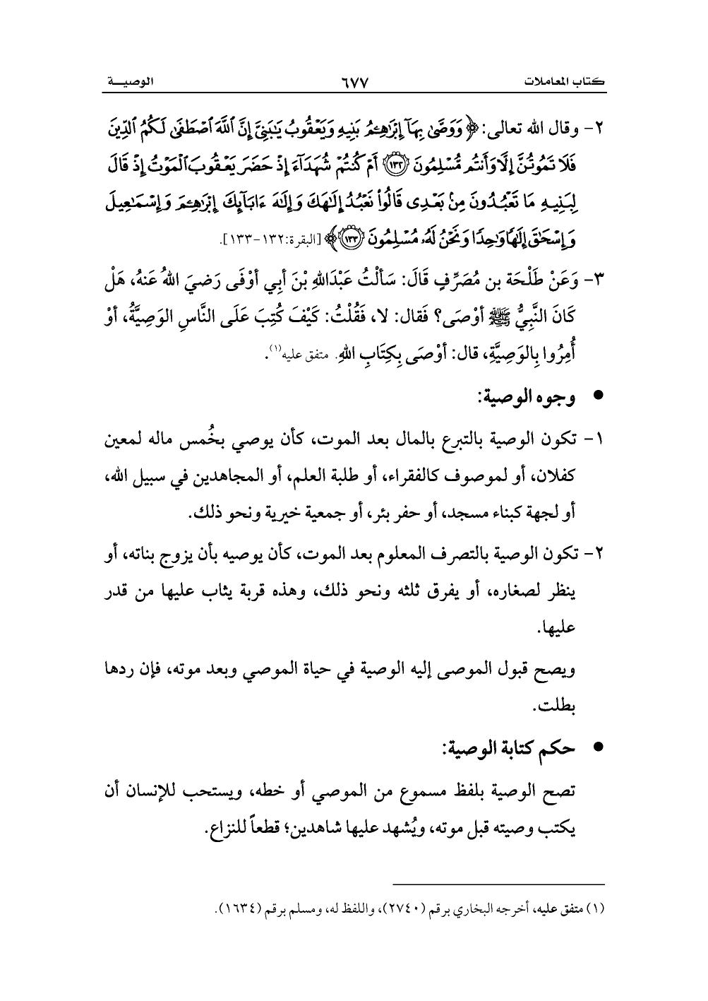 3 - وَعَنْ طَلْحَة بن مُصَرِّفٍ قَالَ: سَألْتُ عَبْدَاللهِ بْنَ أبِي أوْفَى رَضيَ اللهُ عَنهُ، هَلْ كَانَ النَّبِيُّ - صلى الله عليه وسلم - أوْصَى؟ فَقال: لا، فَقُلْتُ: كَيْفَ كُتِبَ عَلَى النَّاسِ الوَصِيَّةُ، أوْ أُمِرُوا بِالوَصِيَّةِ، قال: أوْصَى بِكِتَابِ اللهِ. متفق عليه (¬1).