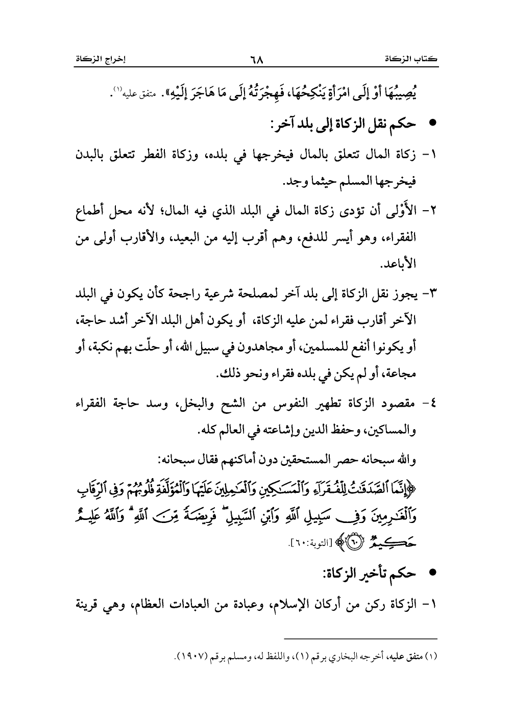 3 - يجوز نقل الزكاة إلى بلد آخر لمصلحة شرعية راجحة كأن يكون في البلد الآخر أقارب فقراء لمن عليه الزكاة، أو يكون أهل البلد الآخر أشد حاجة، أو يكونوا أنفع للمسلمين، أو مجاهدون في سبيل الله، أو حلّت بهم نكبة، أو مجاعة، أو لم يكن في بلده فقراء ونحو ذلك.
