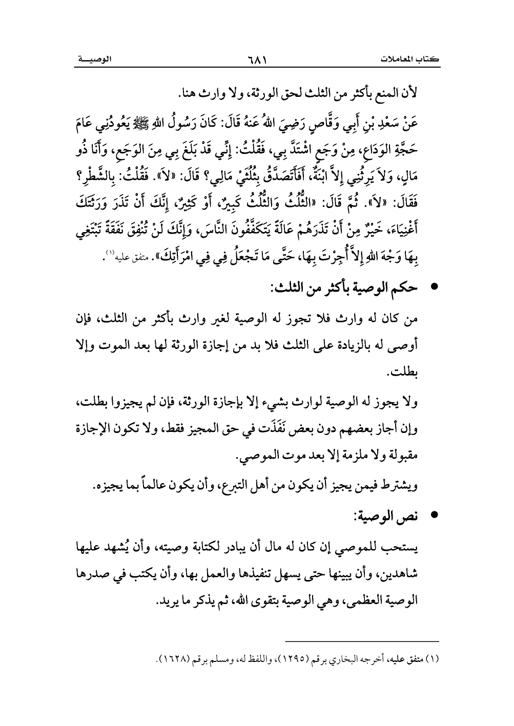 عَنْ سَعْدِ بْنِ أَبِي وَقَّاصٍ رَضِيَ اللهُ عَنهُ قَالَ: كَانَ رَسُولُ اللهِ - صلى الله عليه وسلم - يَعُودُنِي عَامَ حَجَّةِ الوَدَاعِ، مِنْ وَجَعٍ اشْتَدَّ بِي، فَقُلْتُ: إِنِّي قَدْ بَلَغَ بِي مِنَ الوَجَعِ، وَأَنَا ذُو مَالٍ، وَلاَ يَرِثُنِي إِلاَّ ابْنَةٌ، أَفَأَتَصَدَّقُ بِثُلُثَيْ مَالِي؟ قَالَ: «لاَ». فَقُلْتُ: بِالشَّطْرِ؟ فَقَالَ: «لاَ». ثُمَّ قَالَ: «الثُّلُثُ وَالثُّلُثُ كَبِيرٌ، أَوْ كَثِيرٌ، إِنَّكَ أَنْ تَذَرَ وَرَثَتَكَ أَغْنِيَاءَ، خَيْرٌ مِنْ أَنْ تَذَرَهُمْ عَالَةً يَتَكَفَّفُونَ النَّاسَ، وَإِنَّكَ لَنْ تُنْفِقَ نَفَقَةً تَبْتَغِي بِهَا وَجْهَ اللهِ إِلاَّ أُجِرْتَ بِهَا، حَتَّى مَا تَجْعَلُ فِي فِي امْرَأَتِكَ». متفق عليه (¬1).