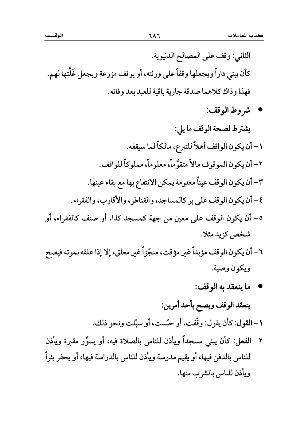 2 - الفعل: كأن يبني مسجداً ويأذن للناس بالصلاة فيه، أو يسوِّر مقبرة ويأذن للناس بالدفن فيها، أو يقيم مدرسة ويأذن للناس بالدراسة فيها، أو يحفر بئراً ويأذن للناس بالشرب منها.