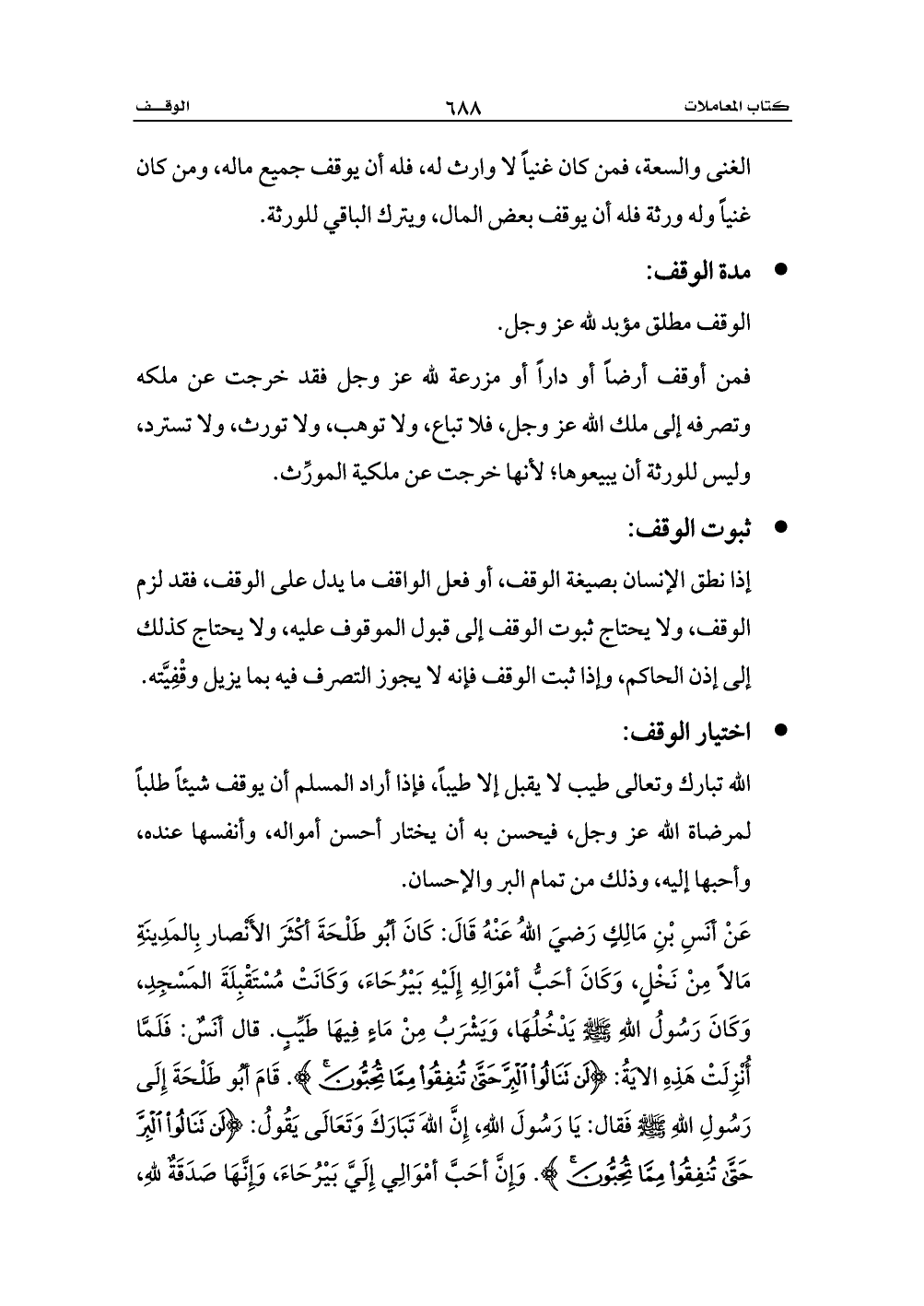 عَنْ أنَسِ بْنِ مَالِكٍ رَضيَ اللهُ عَنْهُ قَالَ: كَانَ أبُو طَلْحَةَ أكْثَرَ الأَنْصار بِالمَدِينَةِ مَالاً مِنْ نَخْلٍ، وَكَانَ أحَبُّ أمْوَالِهِ إِلَيْهِ بَيْرُحَاءَ، وَكَانَتْ مُسْتَقْبِلَةَ المَسْجِدِ، وَكَانَ رَسُولُ اللهِ - صلى الله عليه وسلم - يَدْخُلُهَا، وَيَشْرَبُ مِنْ مَاءٍ فِيهَا طَيِّبٍ. قال أنَسٌ: فَلَمَّا
