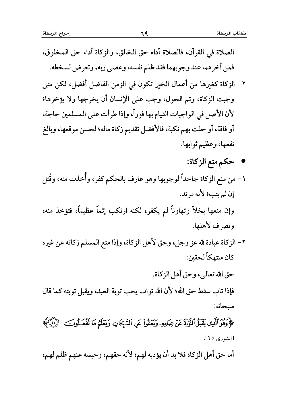 2 - الزكاة عبادة لله عز وجل، وحق لأهل الزكاة، وإذا منع المسلم زكاته عن غيره كان منتهكاً لحقين: