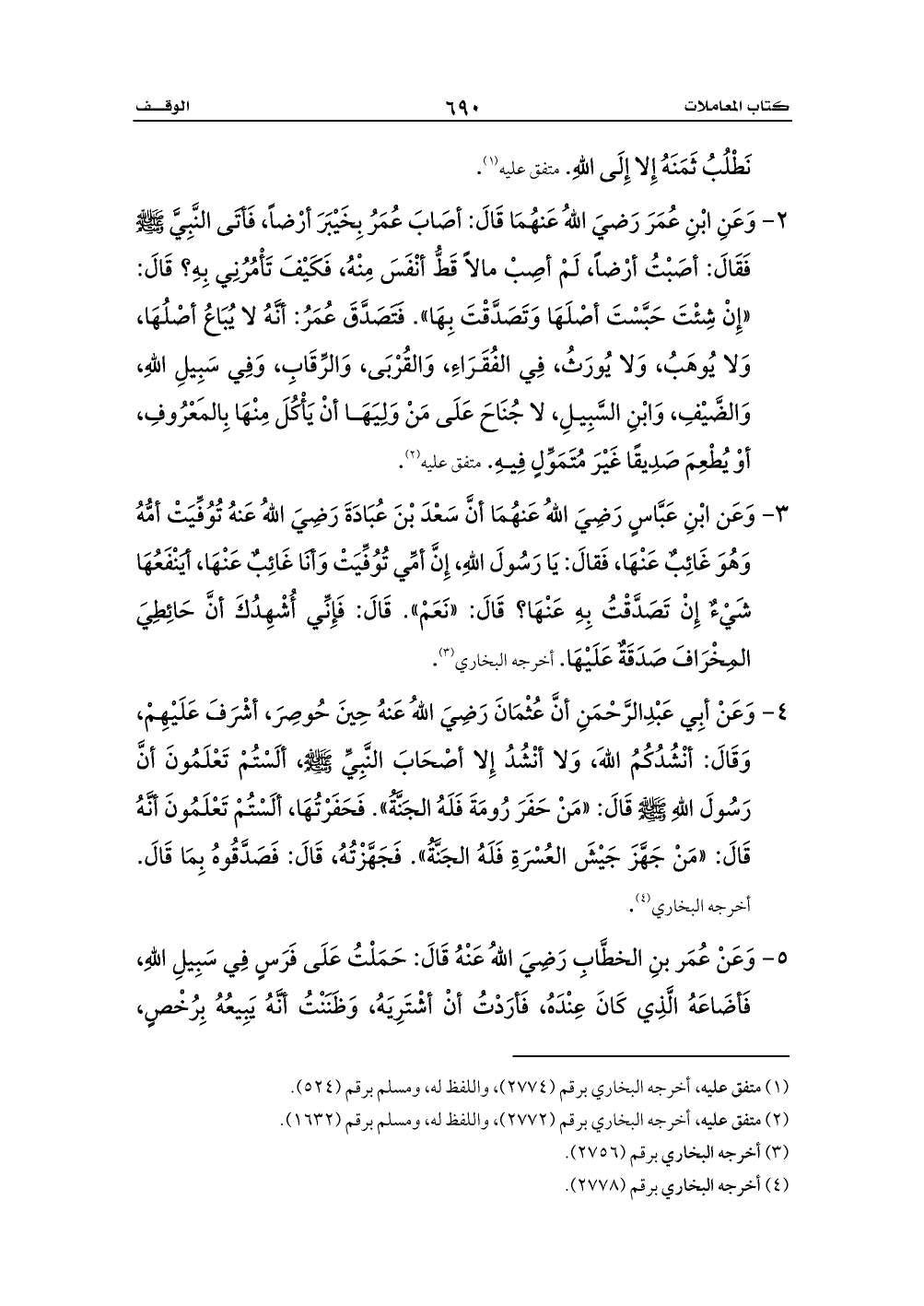 2 - وَعَنِ ابْنِ عُمَرَ رَضيَ اللهُ عَنهُمَا قَالَ: أصَابَ عُمَرُ بِخَيْبَرَ أرْضاً، فَأتَى النَّبِيَّ - صلى الله عليه وسلم - فَقَالَ: أصَبْتُ أرْضاً، لَمْ أصِبْ مالاً قَطُّ أنْفَسَ مِنْهُ، فَكَيْفَ تَأْمُرُنِي بِهِ؟ قَالَ: «إِنْ شِئْتَ حَبَّسْتَ أصْلَهَا وَتَصَدَّقْتَ بِهَا». فَتَصَدَّقَ عُمَرُ: أنَّهُ لا يُبَاعُ أصْلُهَا، وَلا يُوهَبُ، وَلا يُورَثُ، فِي الفُقَرَاءِ، وَالقُرْبَى، وَالرِّقَابِ، وَفِي سَبِيلِ اللهِ، وَالضَّيْفِ، وَابْنِ السَّبِيلِ، لا جُنَاحَ عَلَى مَنْ وَلِيَهَا أنْ يَأْكُلَ مِنْهَا بِالمَعْرُوفِ، أوْ يُطْعِمَ صَدِيقًا غَيْرَ مُتَمَوِّلٍ فِيهِ. متفق عليه (¬2).