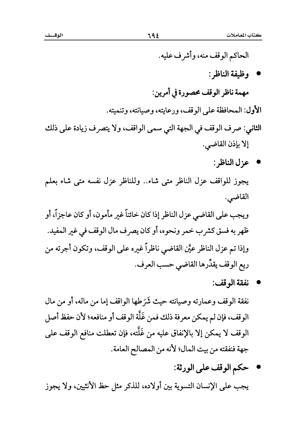 الثاني: صرف الوقف في الجهة التي سمى الواقف، ولا يتصرف زيادة على ذلك إلا بإذن القاضي.