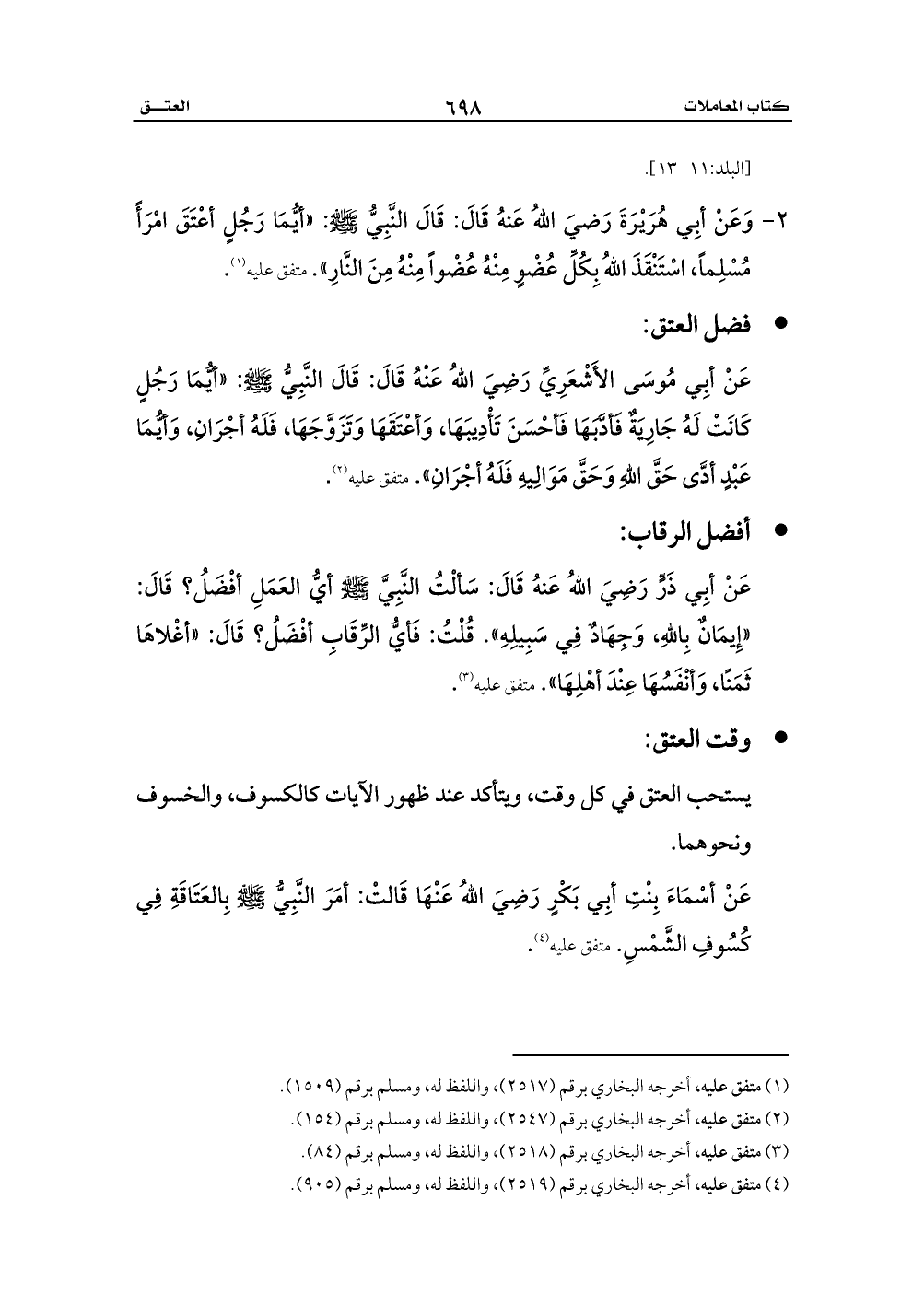 2 - وَعَنْ أبِي هُرَيْرَةَ رَضيَ اللهُ عَنهُ قَالَ: قَالَ النَّبِيُّ - صلى الله عليه وسلم -: «أيُّمَا رَجُلٍ أعْتَقَ امْرَأً مُسْلِماً، اسْتَنْقَذَ اللهُ بِكُلِّ عُضْوٍ مِنْهُ عُضْواً مِنْهُ مِنَ النَّارِ». متفق عليه (¬1).